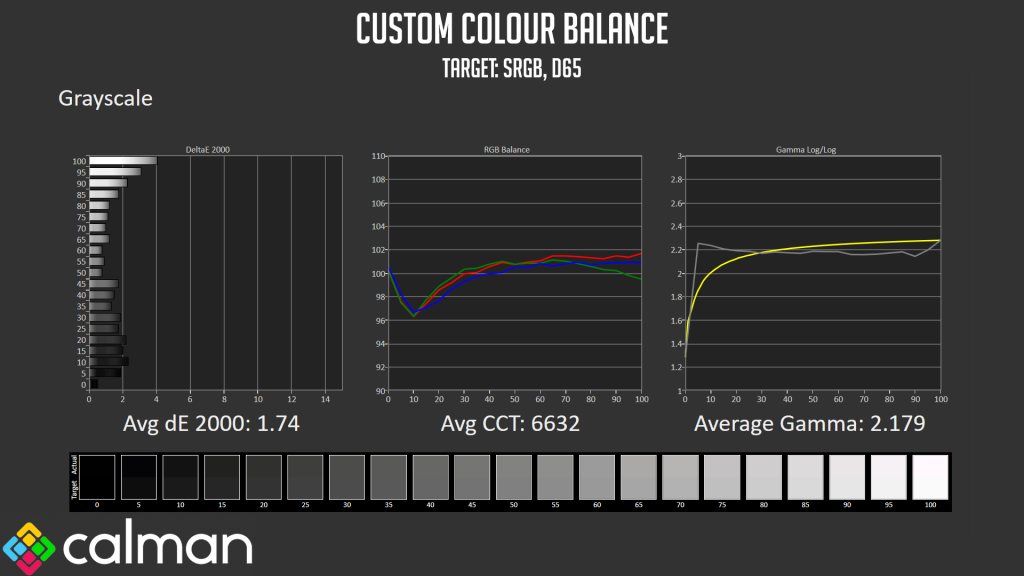 Because the image is too cool out of the box using the default ‘Warm' colour temperature preset, I did re-run the greyscale test but this time using a custom colour balance in the OSD, which I set to Red: 50, Green: 49 and Blue: 47. This did help, improving the average dE to 1.74 and the CCT to 6632, though Gamma is much the same. Calibration should be able to improve things further.
