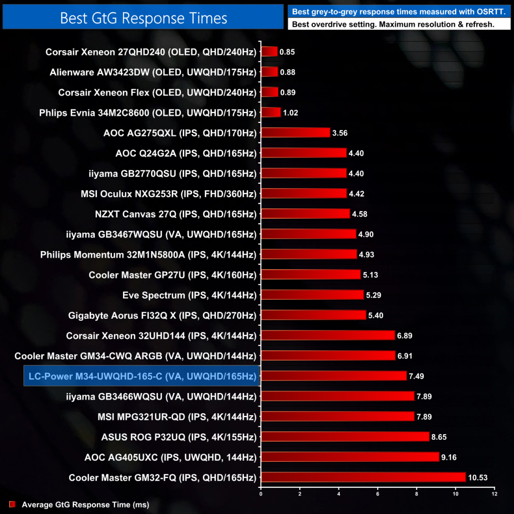 The best mode is the Ultrafast option, which manages an average of 7.49ms, but with a number of transitions still exhibiting response times well over the 6.06ms 165Hz refresh rate window, leaving us with just 57% of transitions coming within that window. The dark-level smearing is a particular problem here, as it unfortunately is known to be for cheaper VA screens.