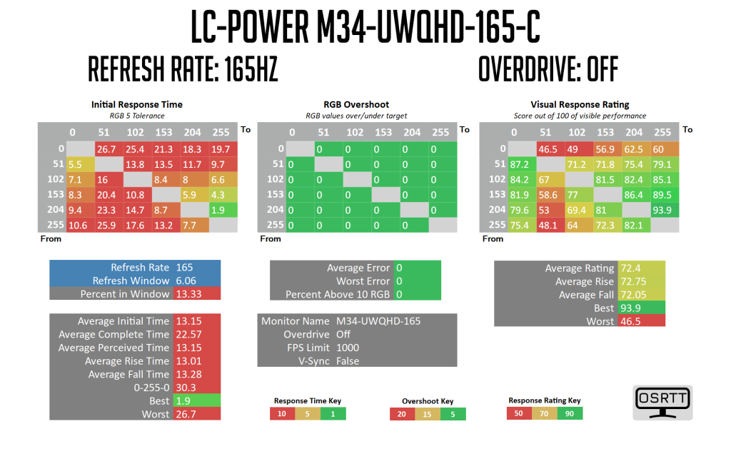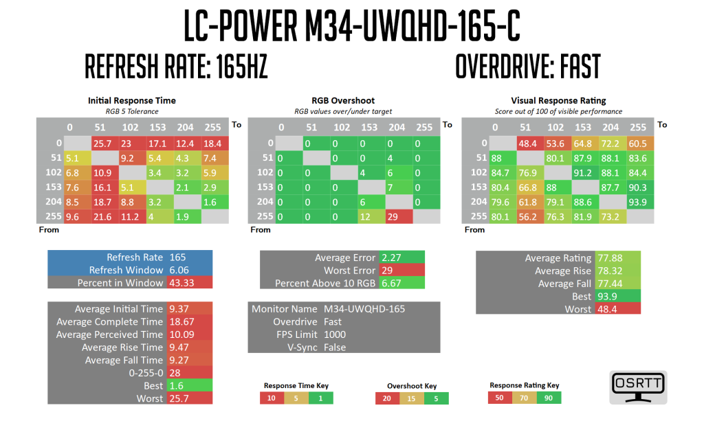 Monitor response time testing is a new addition to our reviews, where we use the Open Source Response Time Tool (OSRTT), developed by TechTeamGB. This measures grey-to-grey response times and presents the results in a series of heatmaps, the style of which you may be familiar with from other reviews.