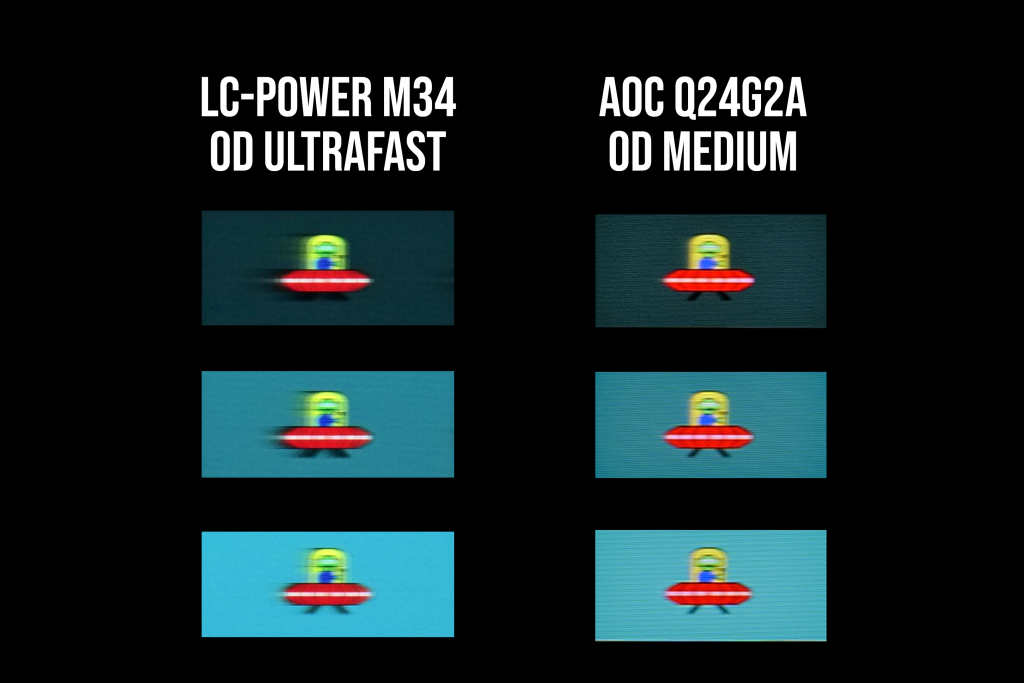 For a visual representation, we can see even using the Ultrafast OD mode, there is a significant amount of trailing and smearing of the image, particularly of darker shades in the top two images – in the bottom image with the light cyan background, this is less noticeable.