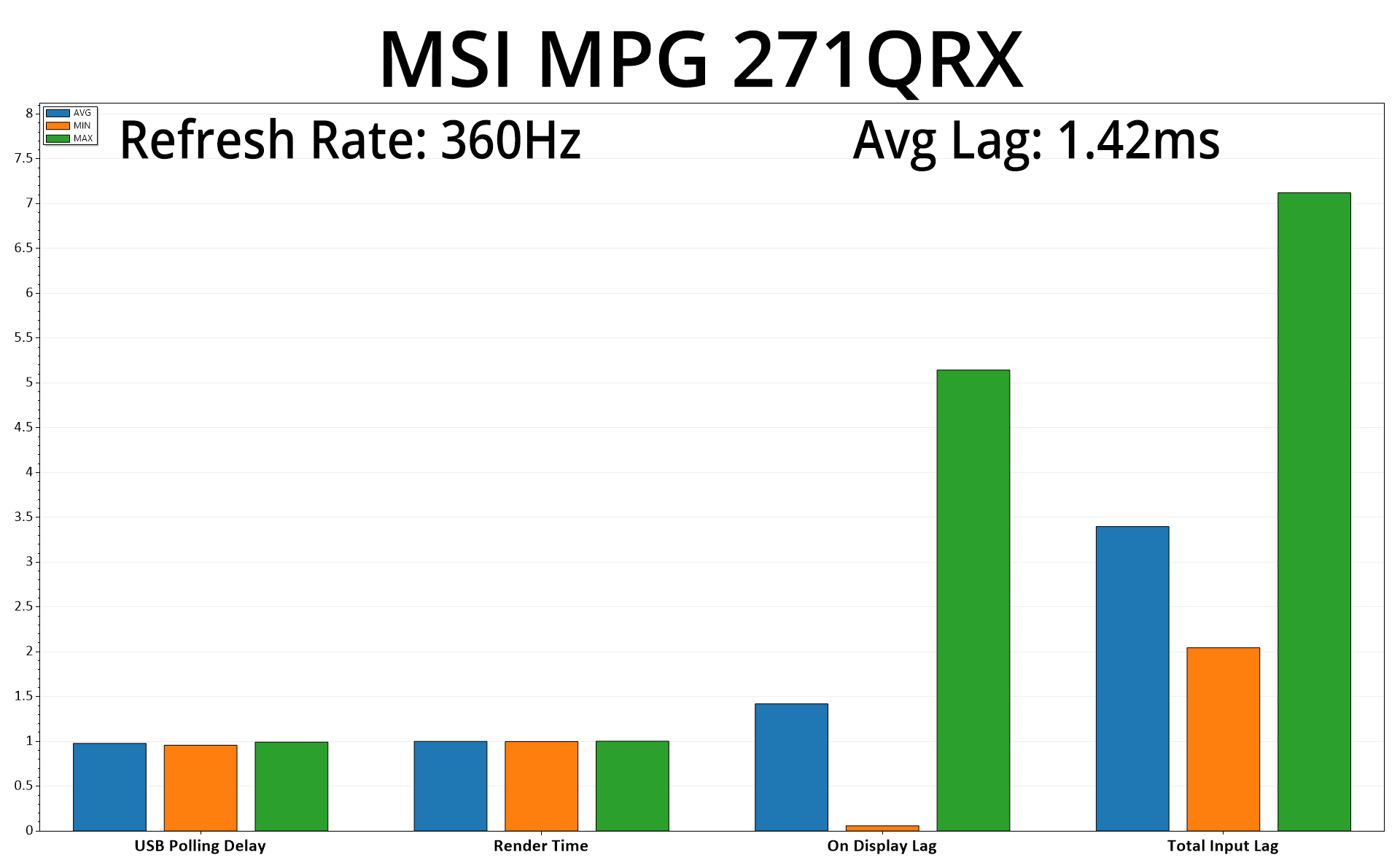 As for input latency, average On Display lag is reported at 1.42ms which is barely half of a single frame at 360Hz (2.78ms), a pretty decent result.