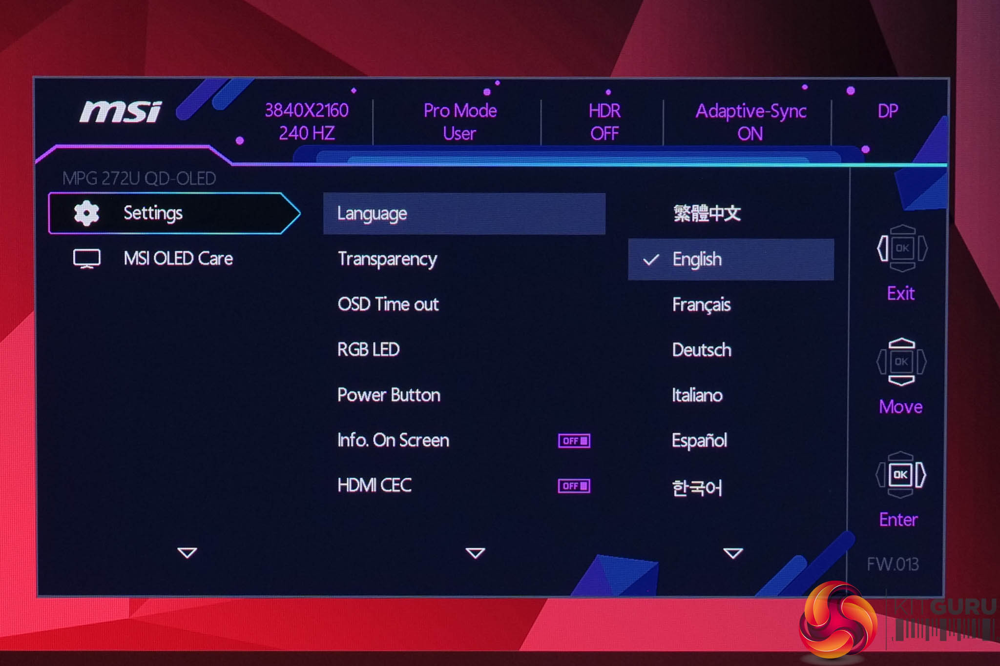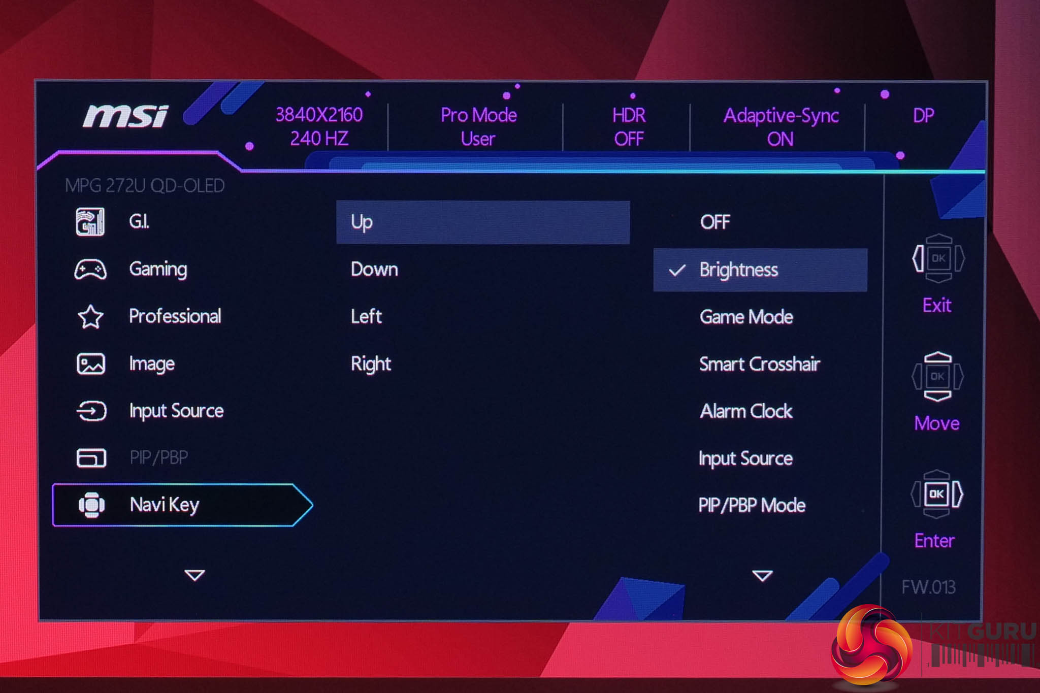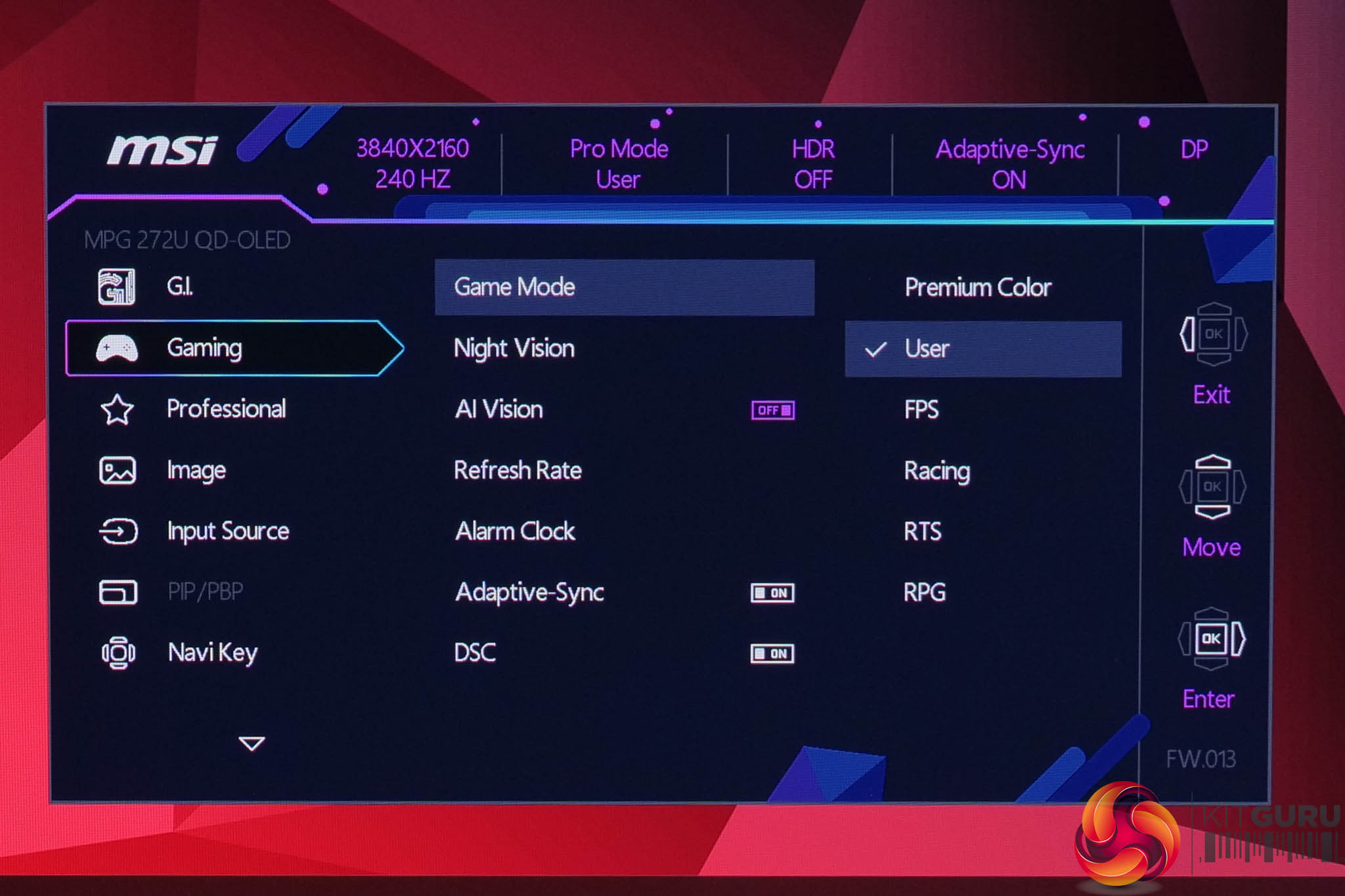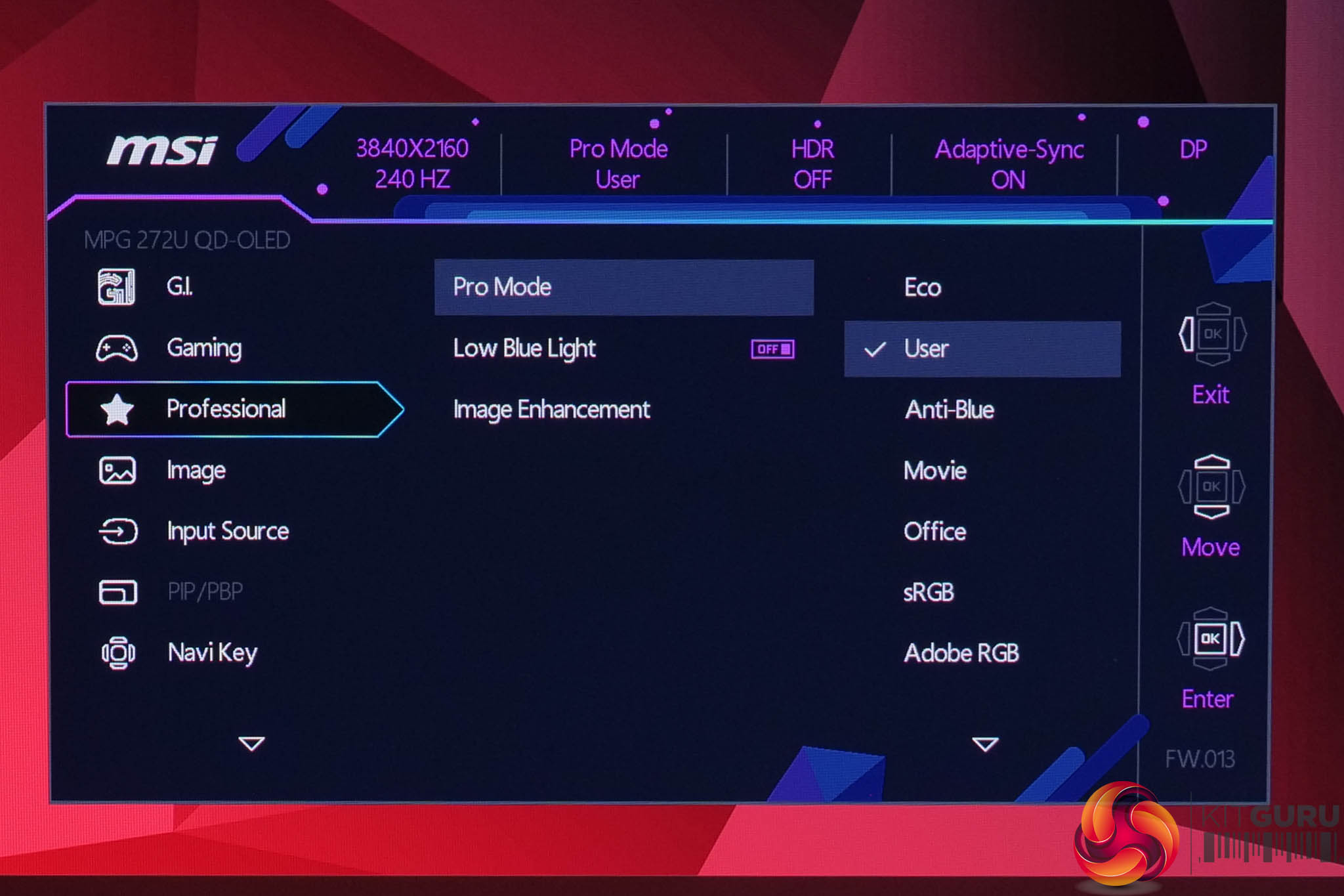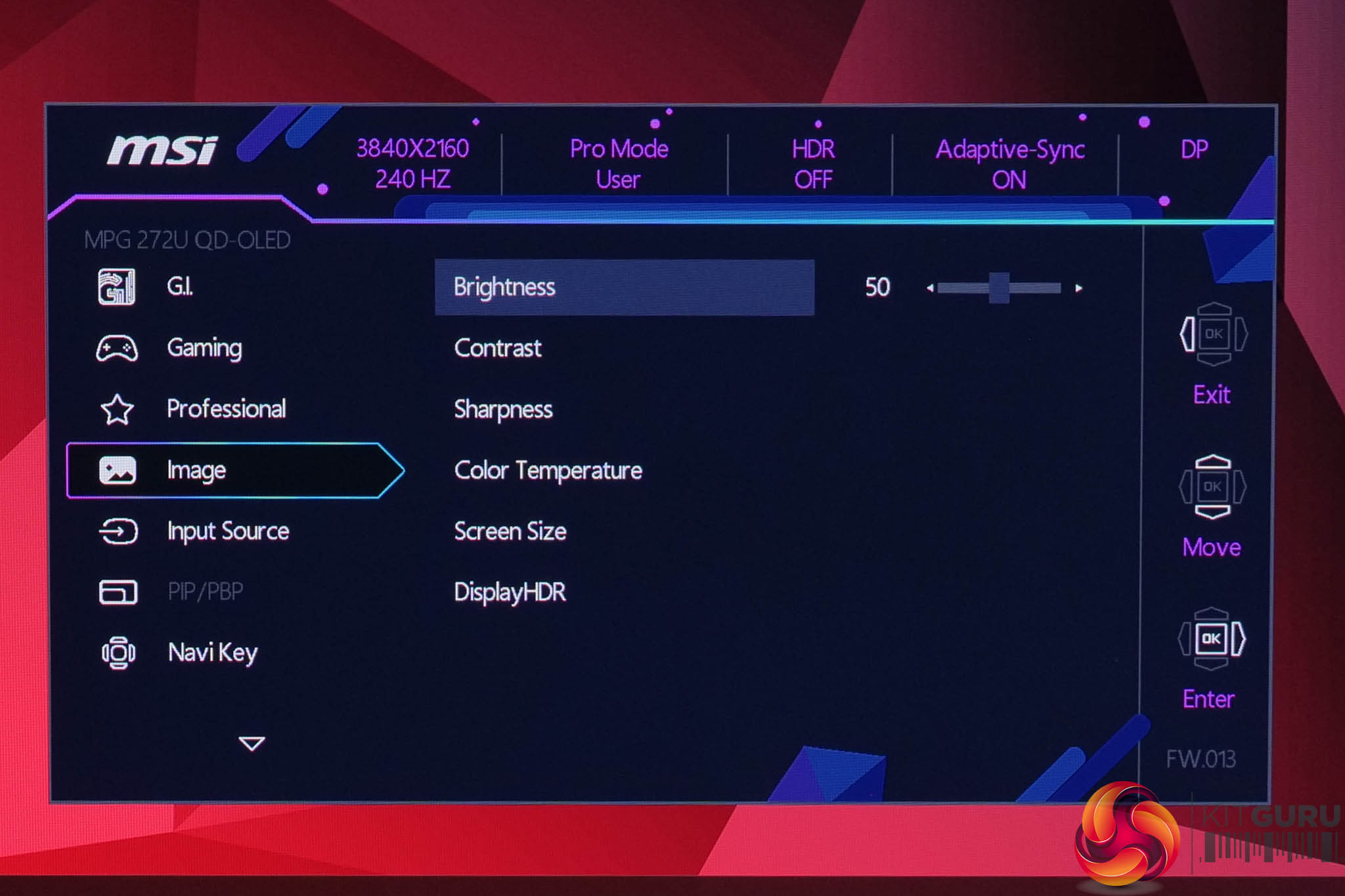 Using the same OSD system as we have come to expect from MSI, I don't have any major complaints here. It is quick to navigate using the joystick, things are sensibly laid out and it's a very well-featured selection too, with all the gamer-specific options we have come to expect as well as customisable white balance, an sRGB emulation mode and so on.