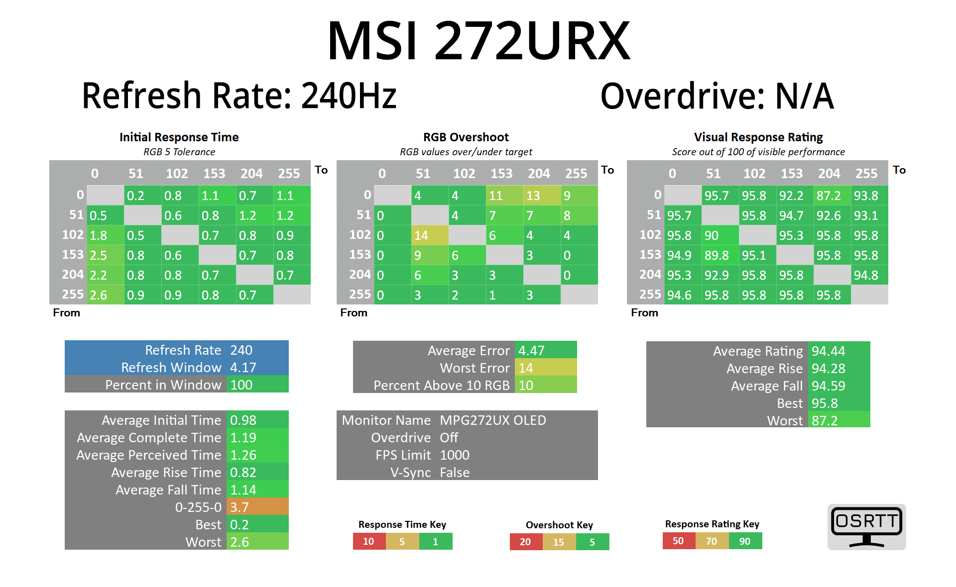 We use the Open Source Response Time Tool (OSRTT), developed by TechTeamGB, for our response time testing. This measures grey-to-grey response times and presents the results in a series of heatmaps, the style of which you may be familiar with from other reviews.