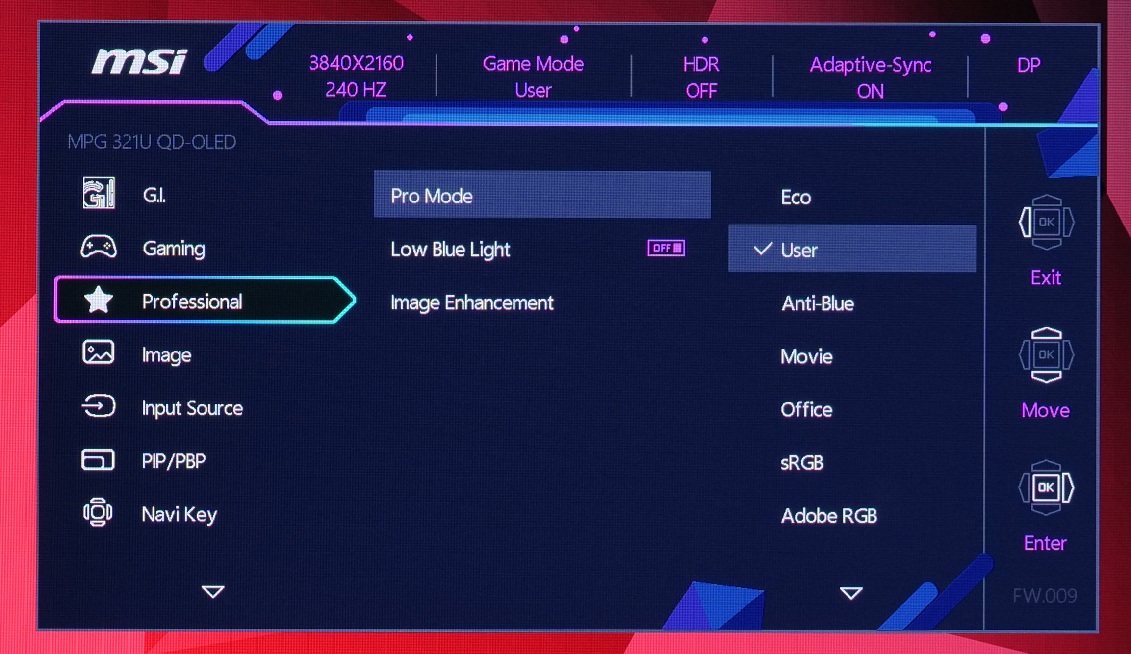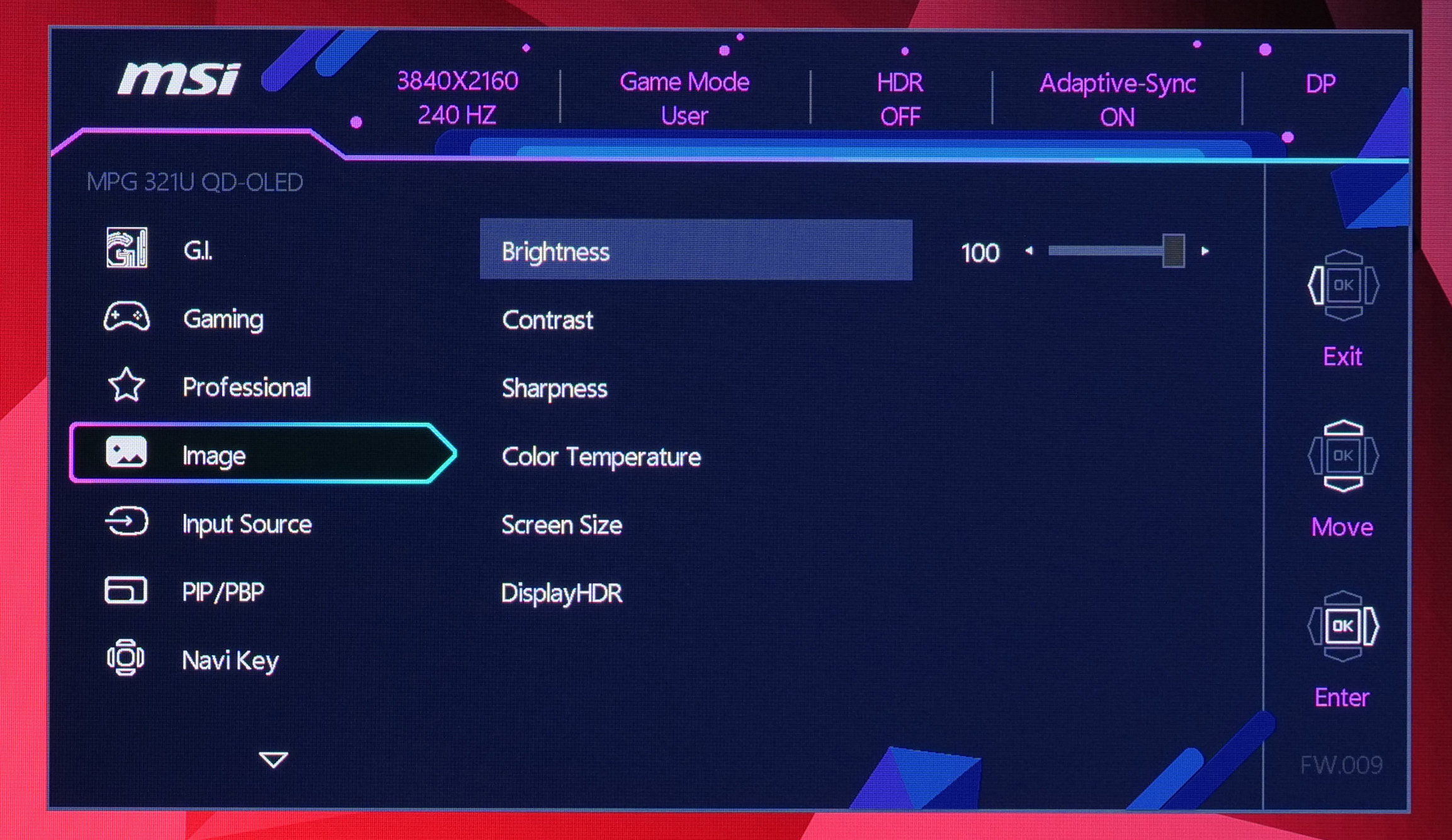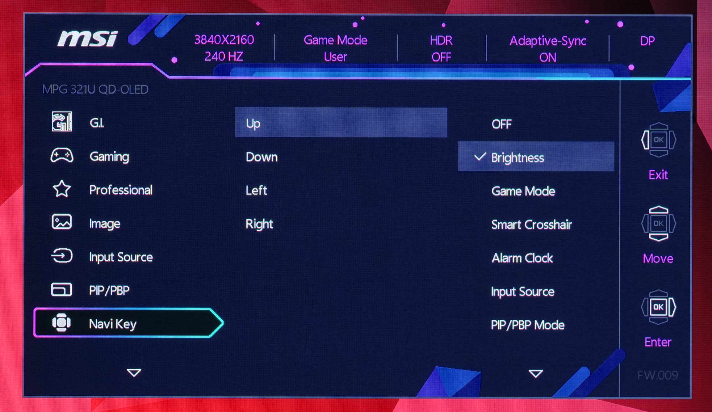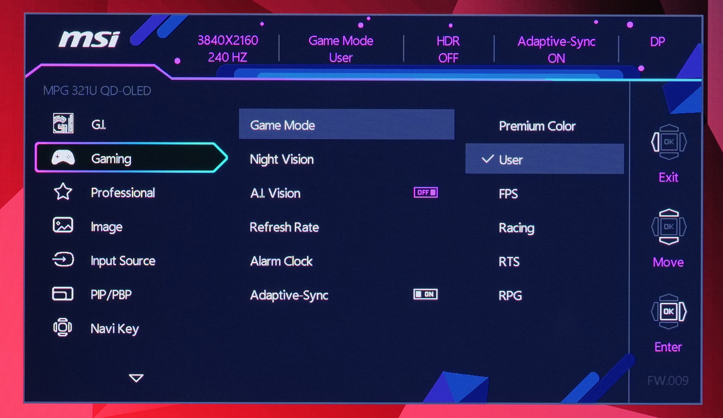Using the same OSD system as we have come to expect from MSI, I don't have any major complaints here. It is quick to navigate using the joystick, things are sensibly laid out and it's a very well-featured selection too, with all the gamer-specific options we have come to expect as well as customisable white balance, an sRGB emulation mode and so on.