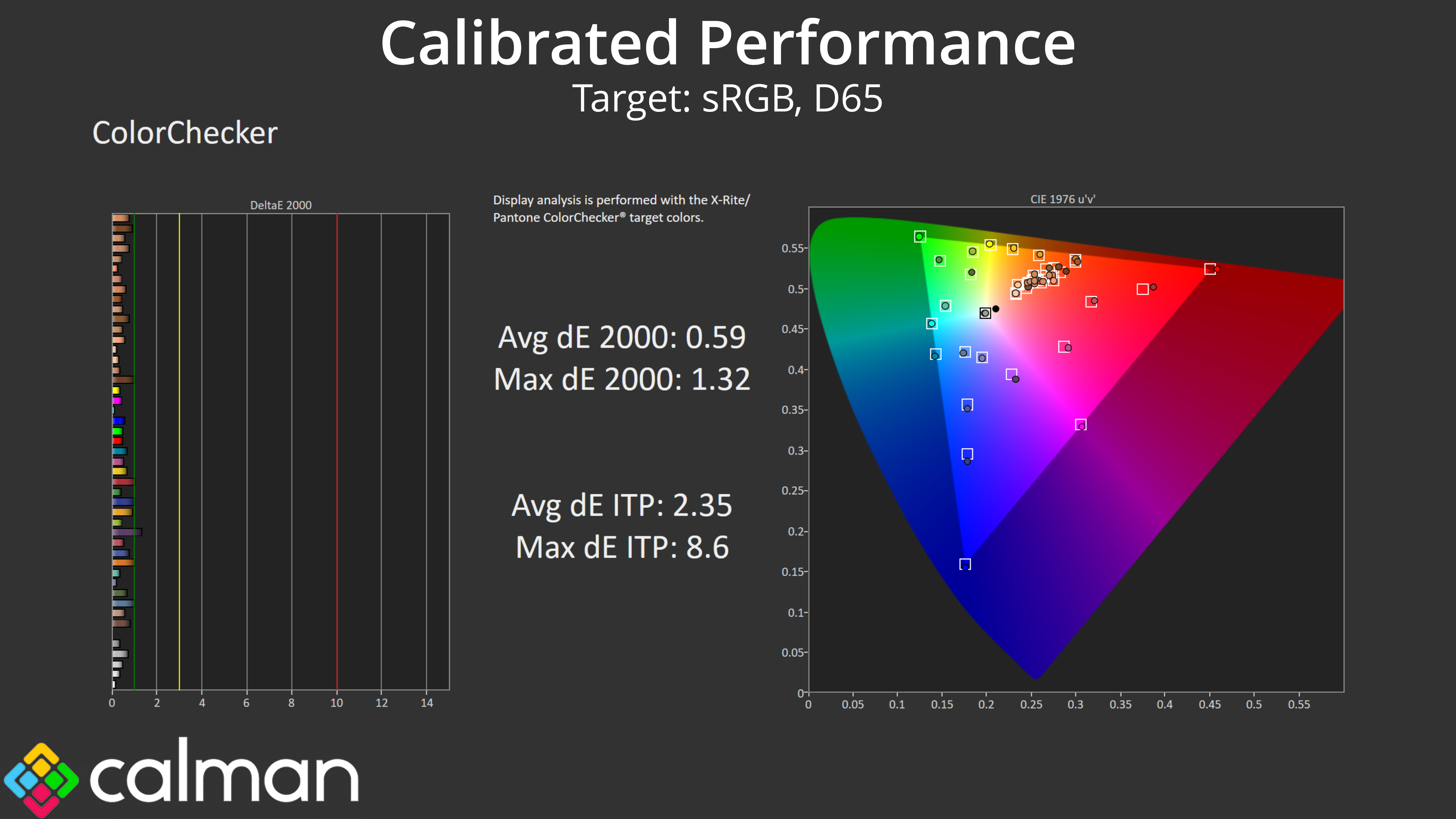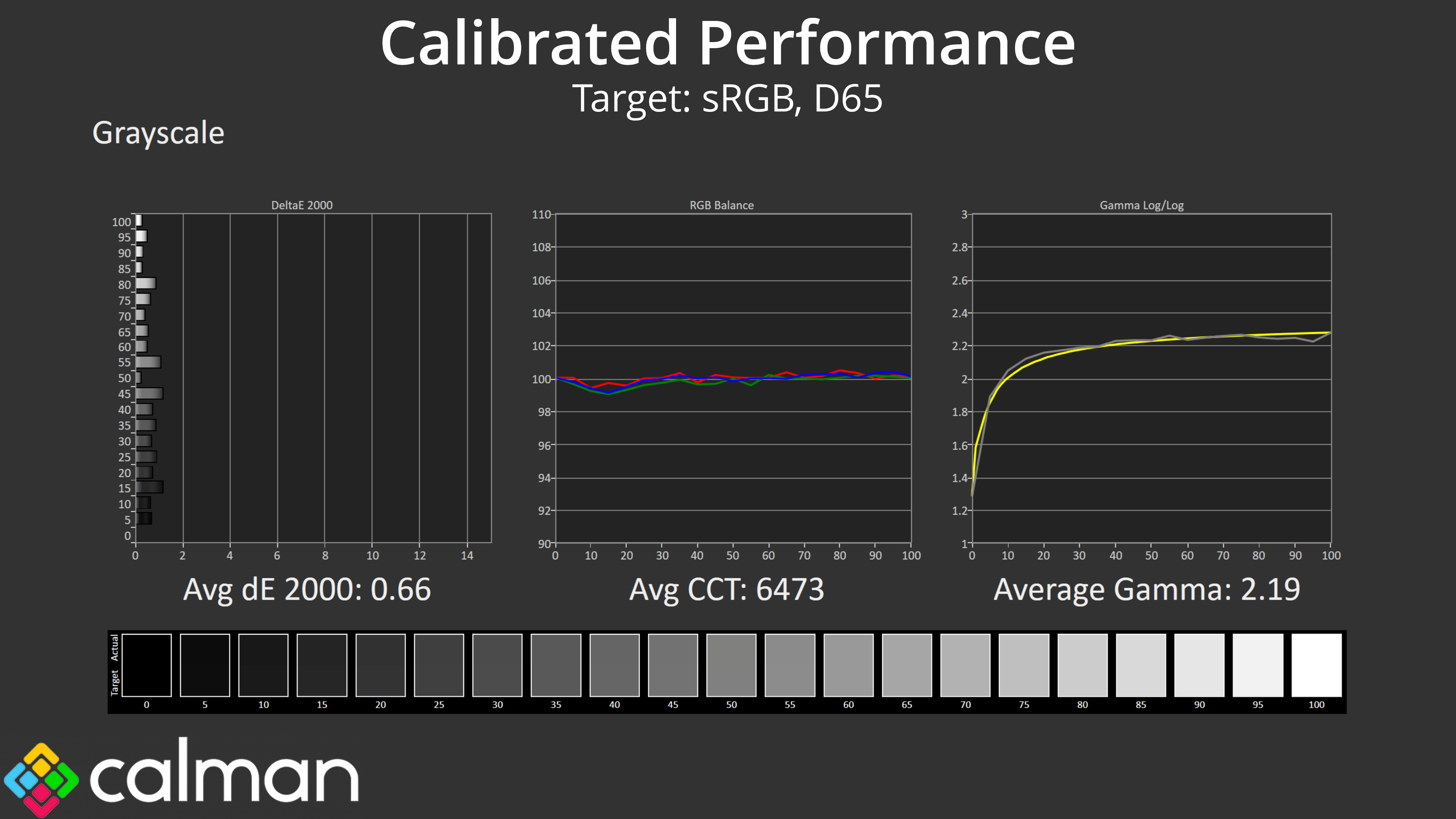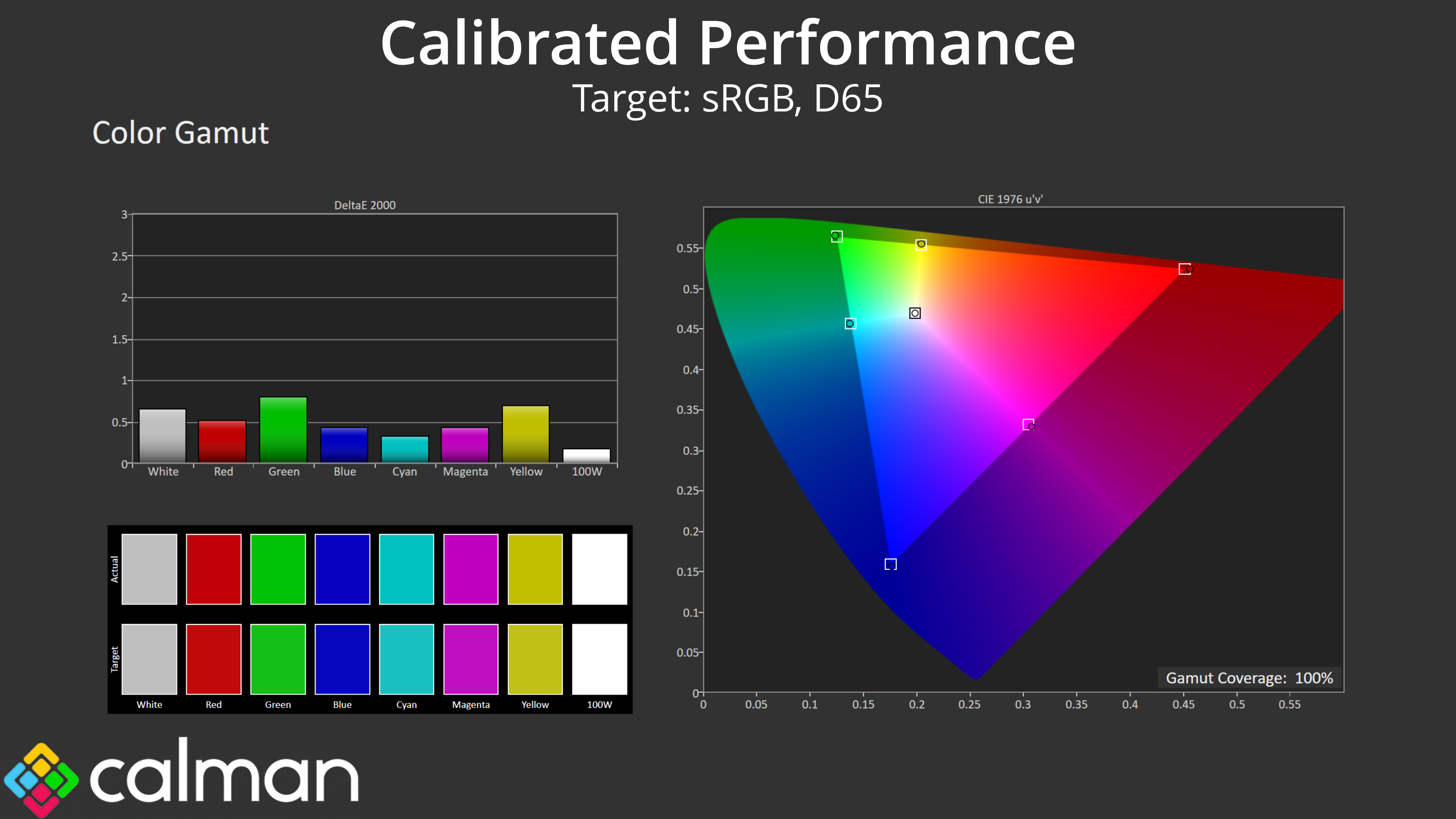Thankfully, Calman Ultimate did a great job, mapping the sRGB gamut perfectly. It also ironed out the colour balance issues, this time delivering an average CCT of 6473K, with near-flawless gamma tracking too. Colour accuracy also improved tremendously, with an average dE 2000 of 0.59.