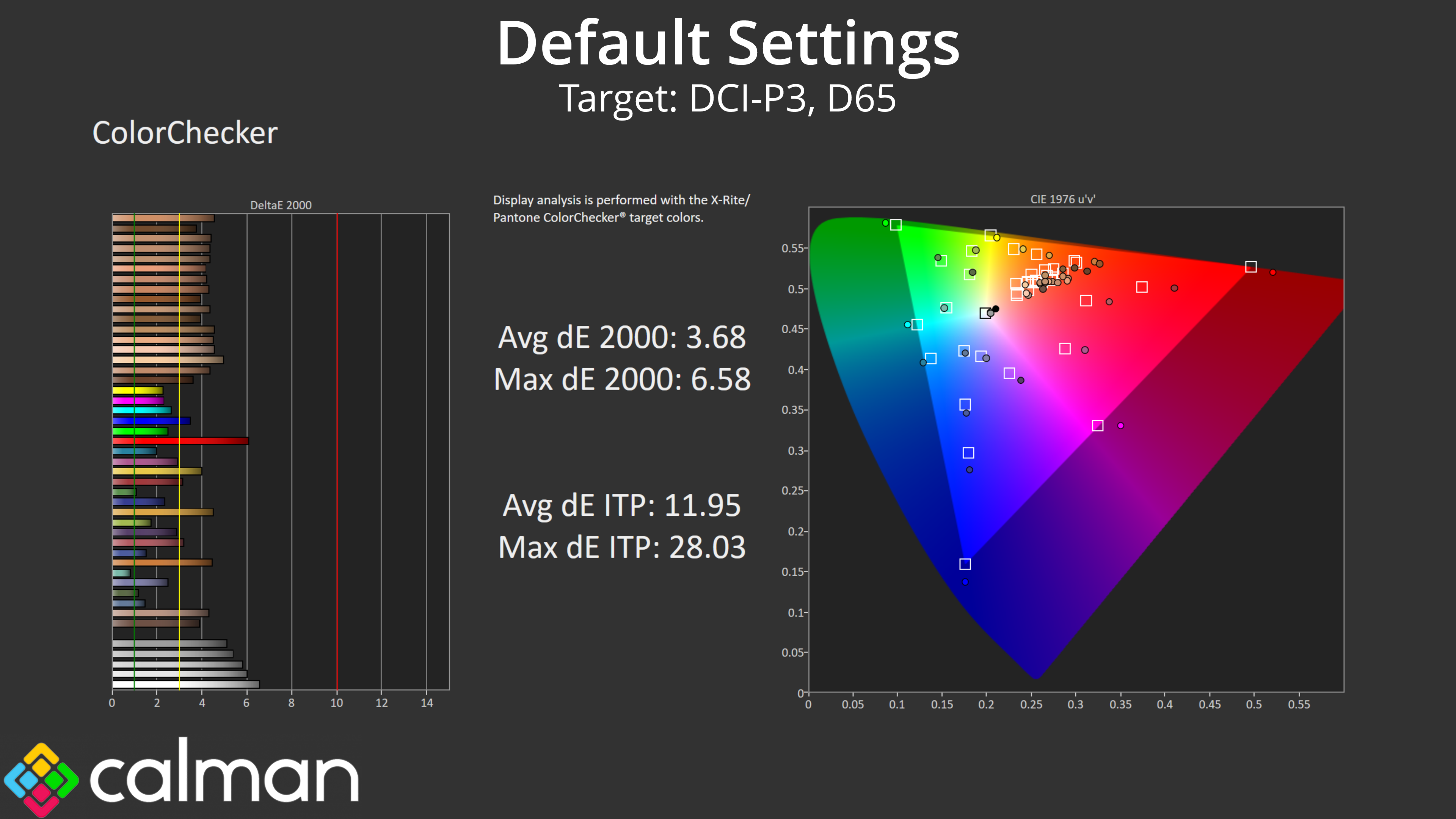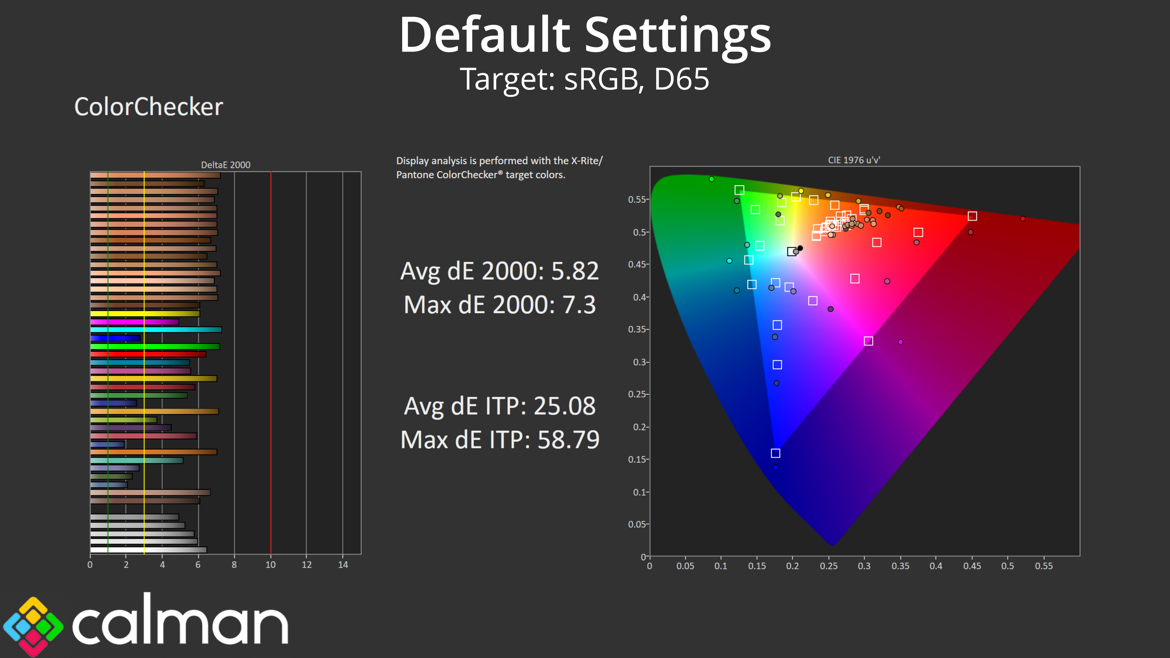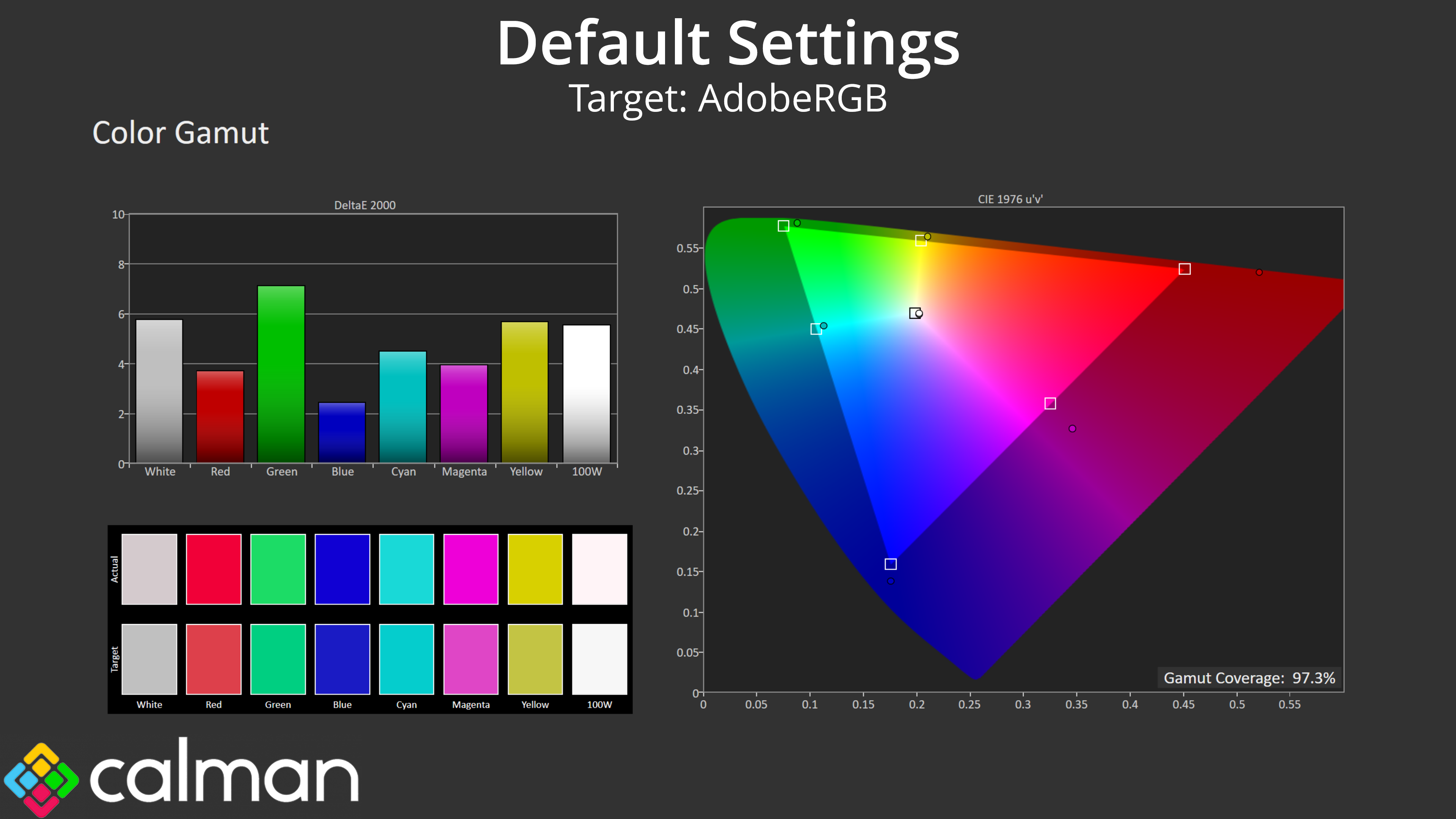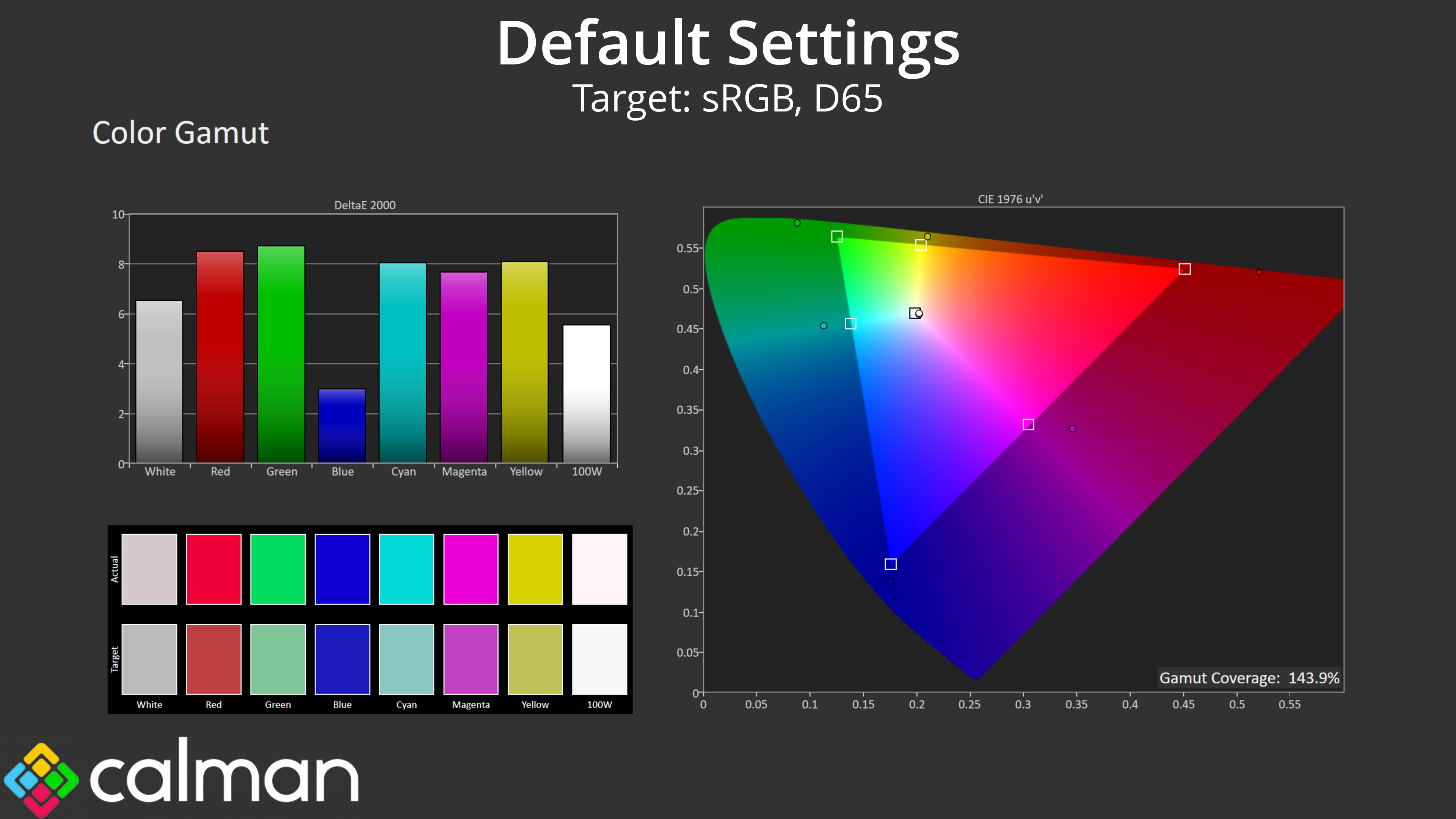 We first run these tests with the display in its out-of-the-box state, with all settings on default. If there is an sRGB emulation option or other useful mode then we may test that too. We then calibrate the screen using the Calman Ultimate software and run the tests again.