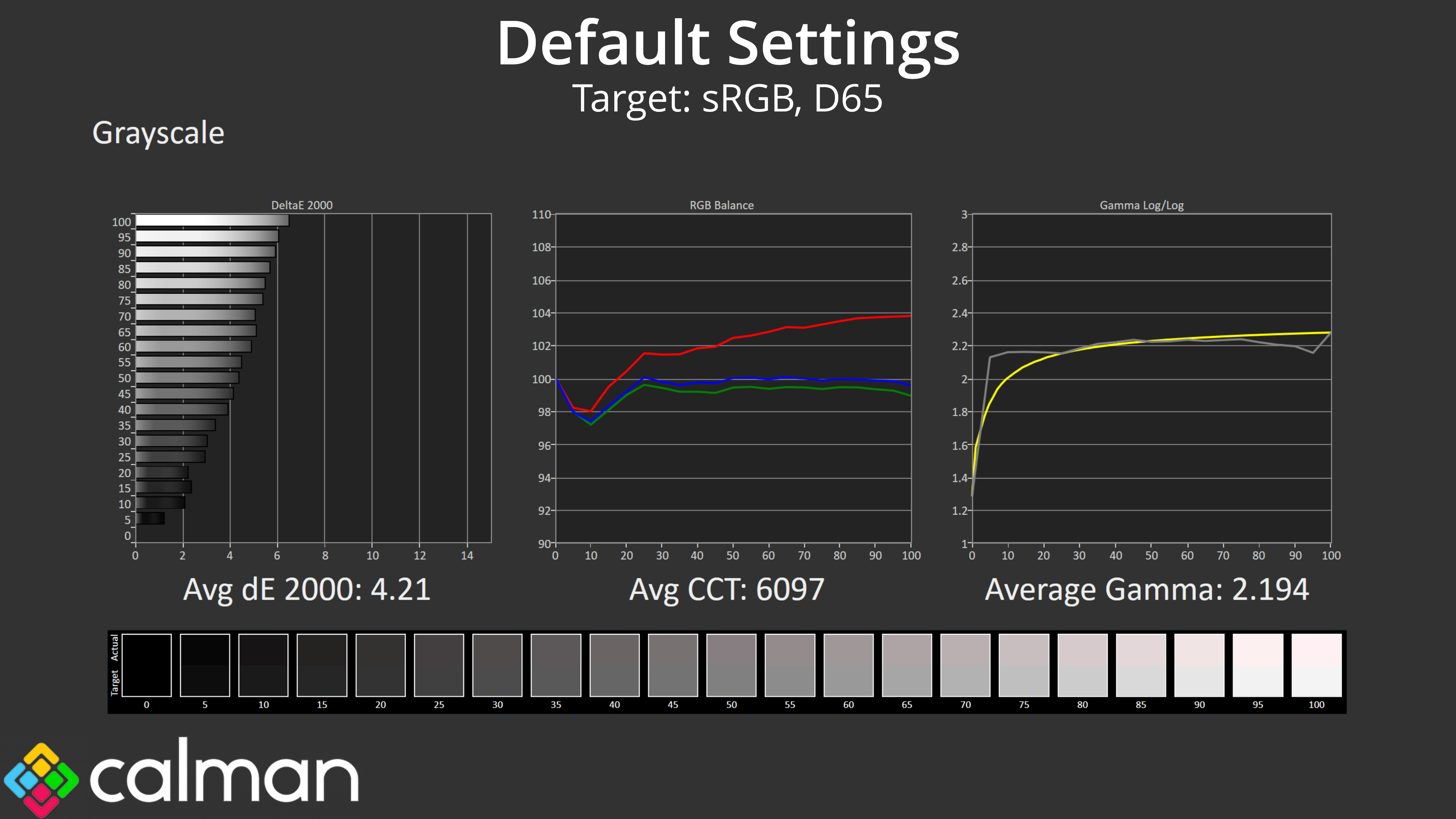 Moving onto greyscale performance, the default configuration isn't terrible but there is a definite red tint to the screen using the default ‘6500K' white balance setting, with an average CCT (Correlated Colour Temperature) of 6097K. That results in a higher-than-expected greyscale dE of 4.21. Gamma is pretty solid though, tracking the desired 2.2. curve closely.