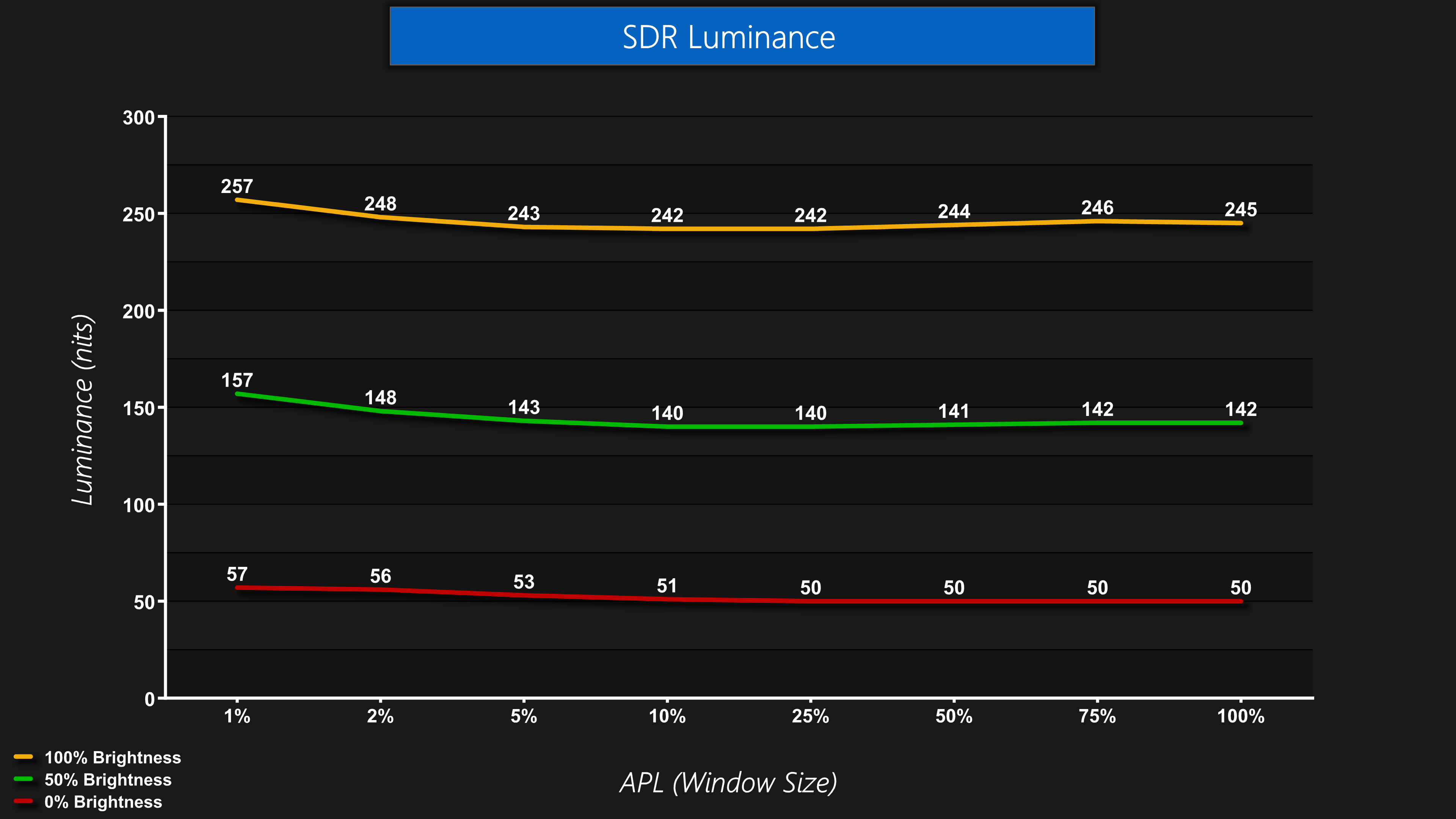 Kicking off with full screen brightness – or luminance, as is technically more accurate – we see a range of 50.1 to 250.8 nits from the 49M2C8900, and this is tested using a full screen 100% white image. Full screen brightness remains lower than LCD-based displays, but 250 nits is still a solid result and should be usable for almost everyone.