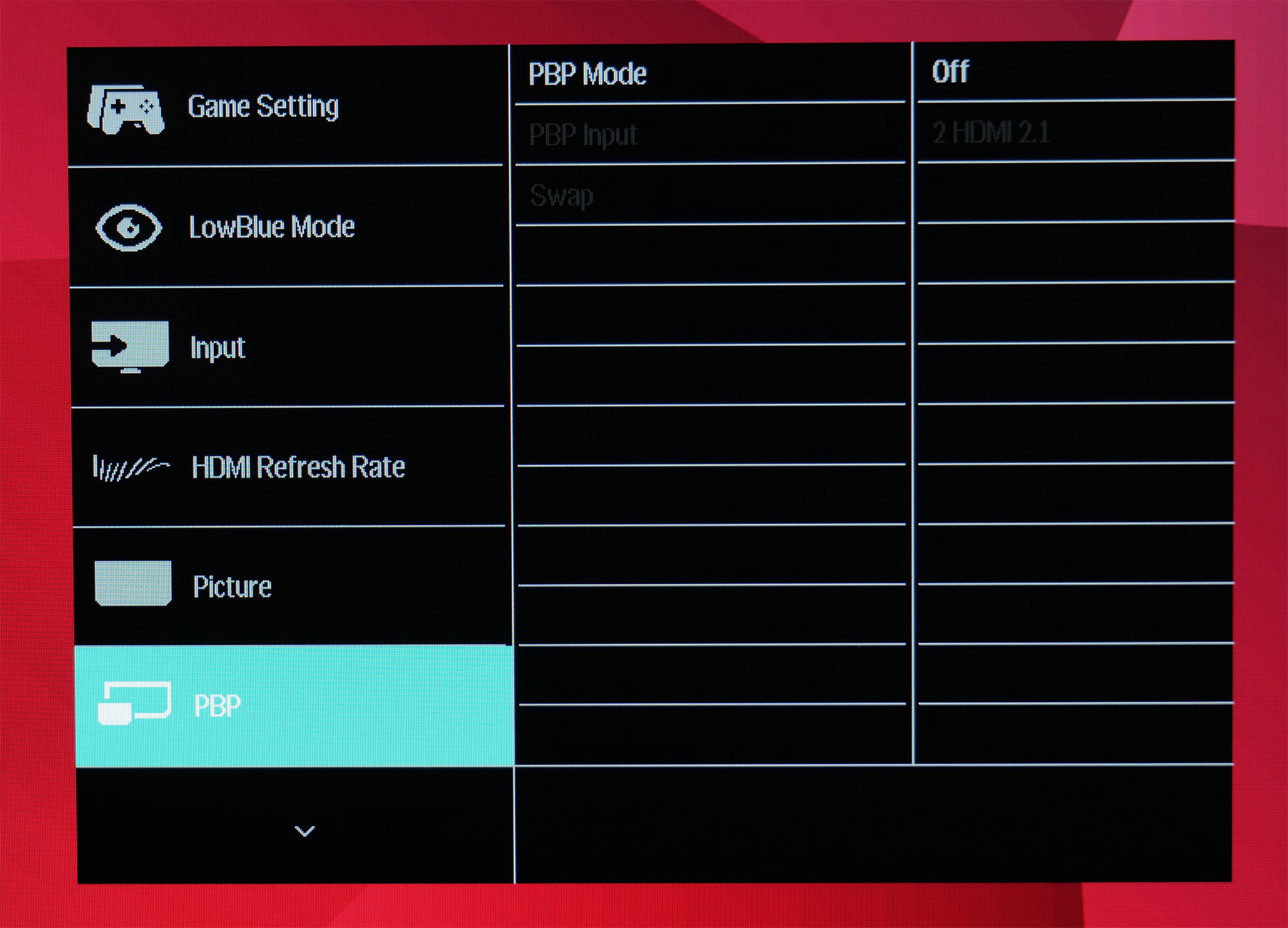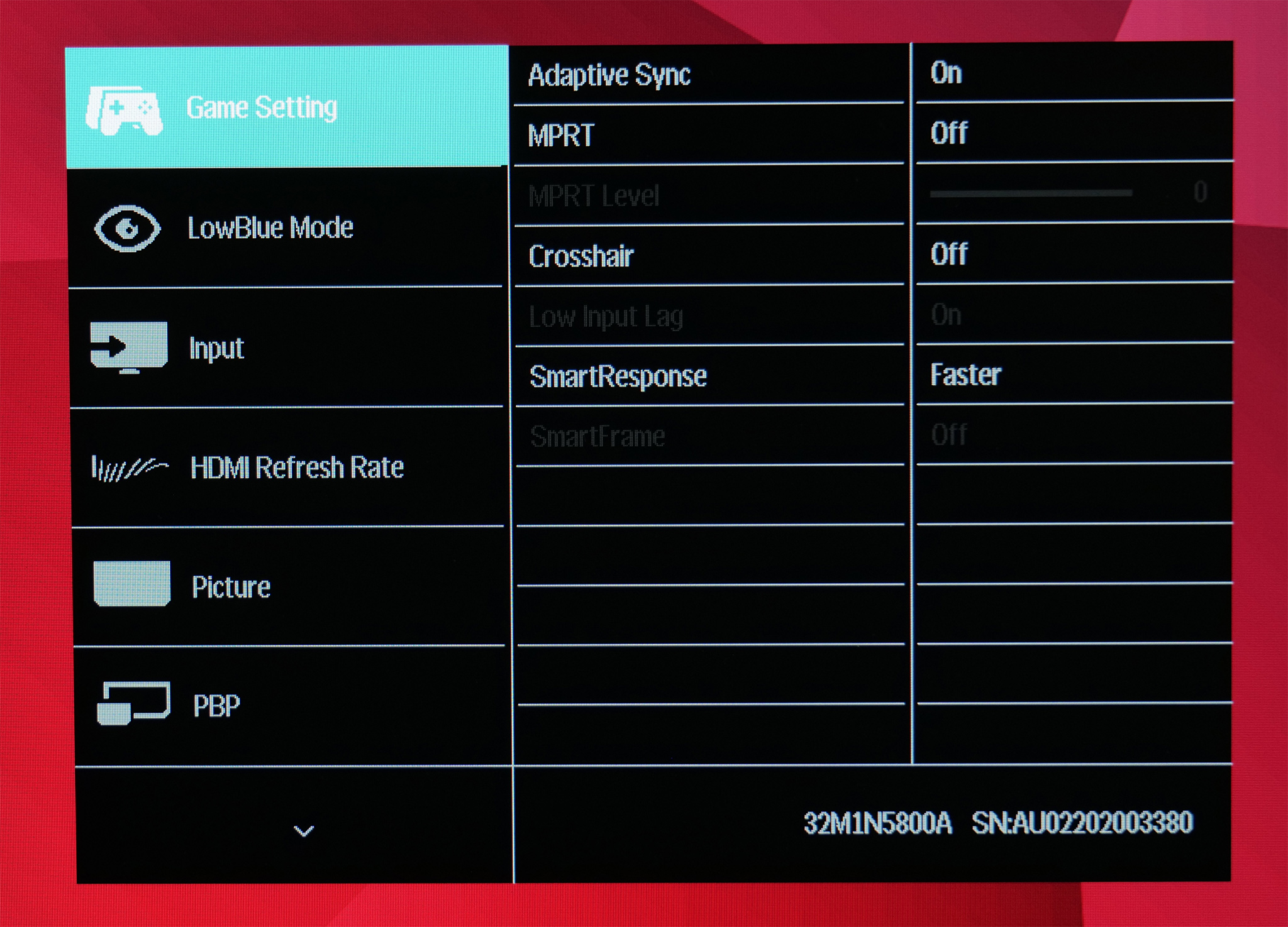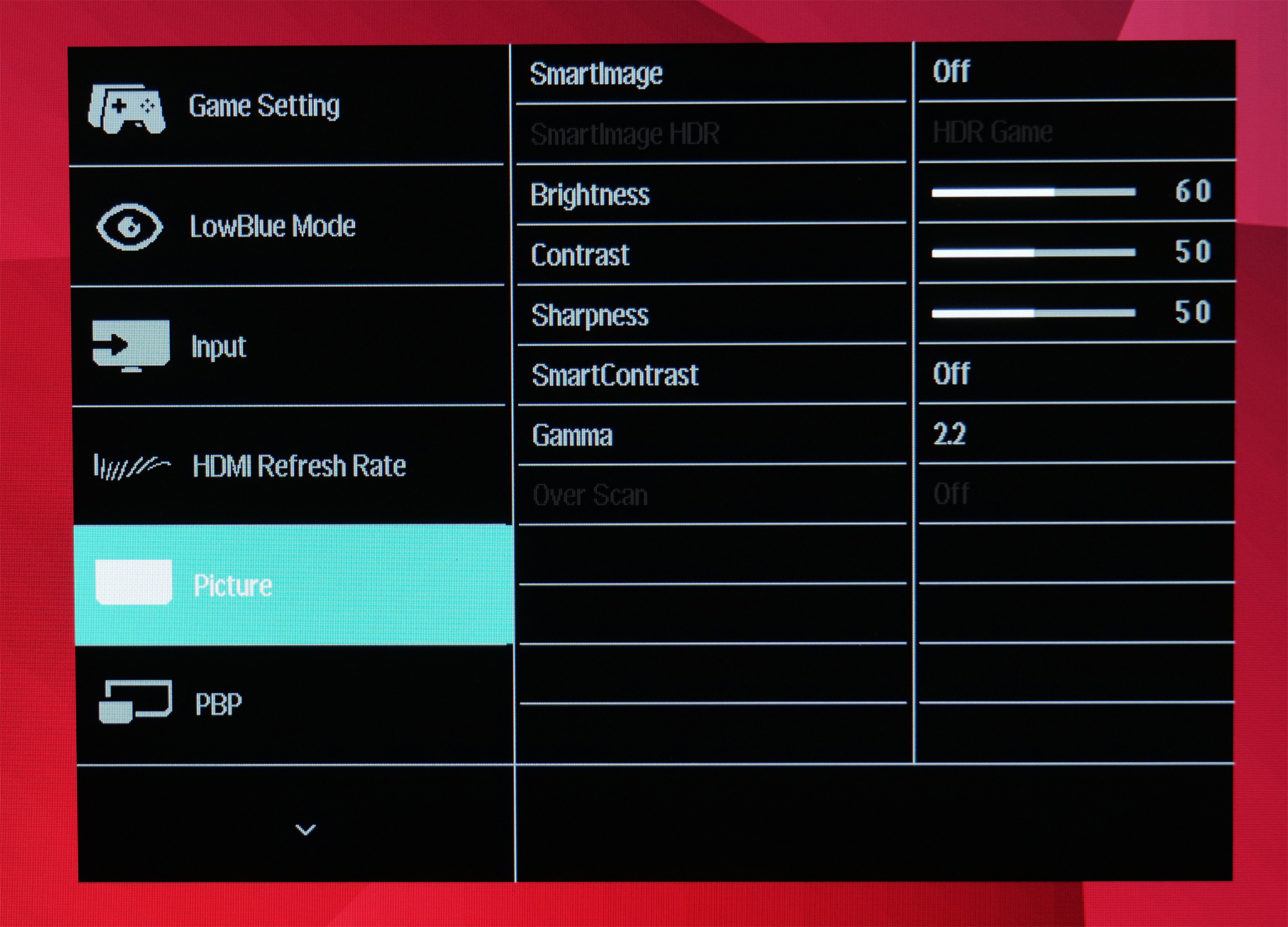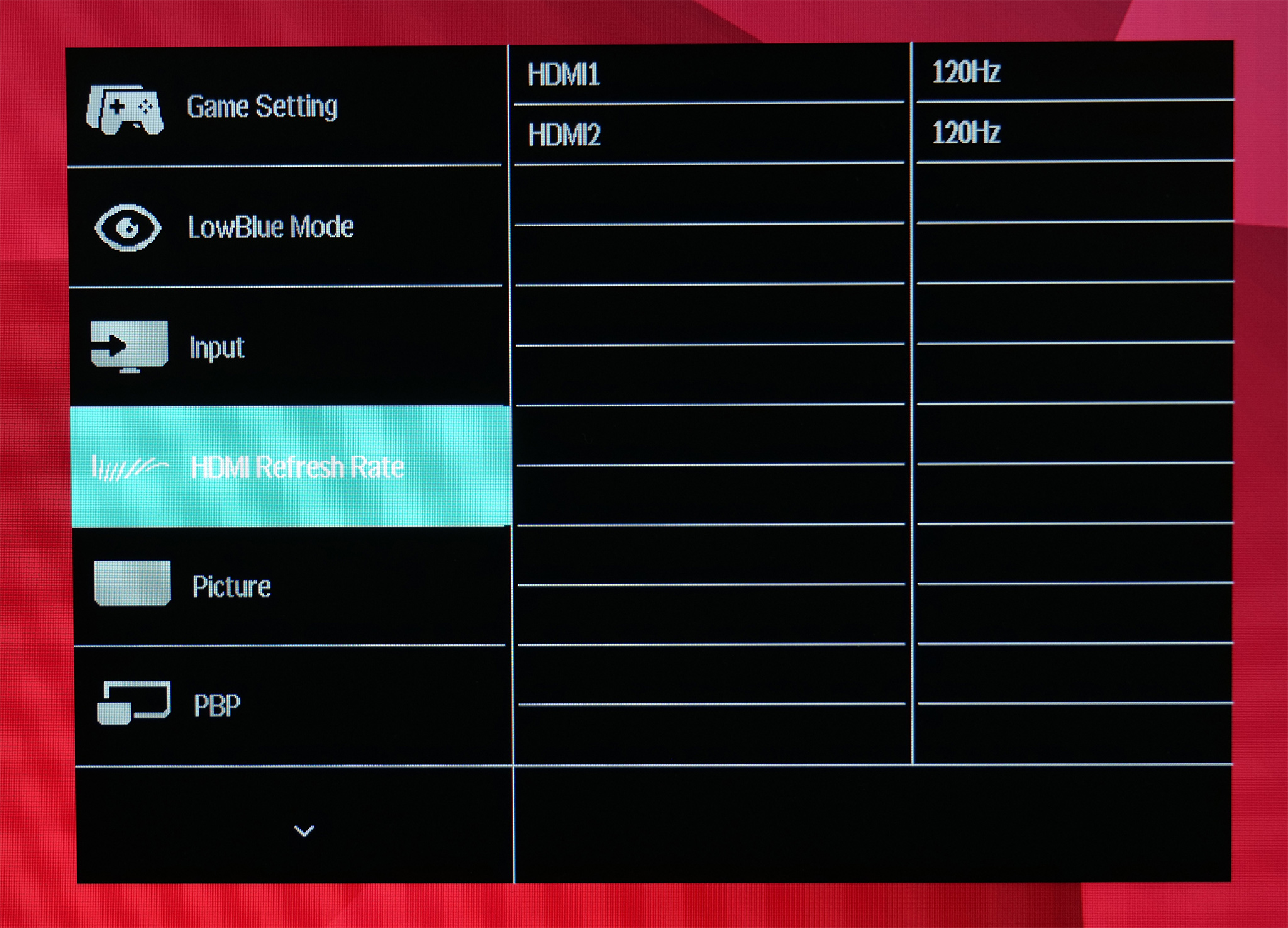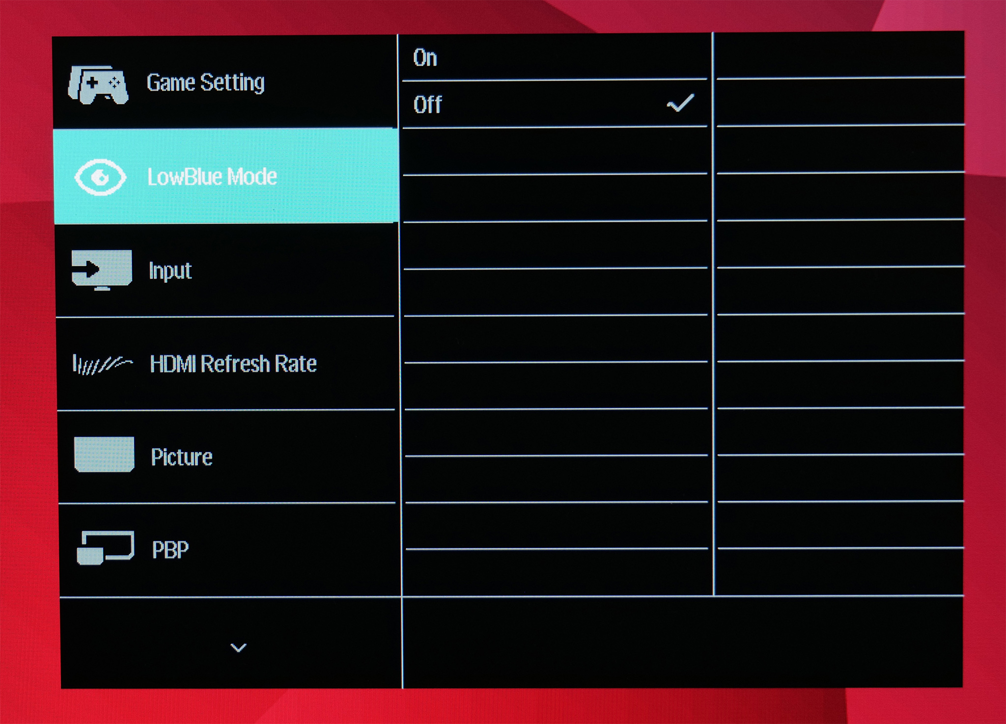 The OSD itself is split into a total of 11 tabs, which you can see below. Some of these feel a bit unnecessary and could be merged with other settings – I'm not sure why a whole tab is needed just for the LowBlue Mode for instance, while it would make sense to combine the HDMI Refresh Rate setting within the Input menu. It's not a big deal and with the joystick you can easily move around the different menus, it just feels like there's quite a number of different tabs to flick through.