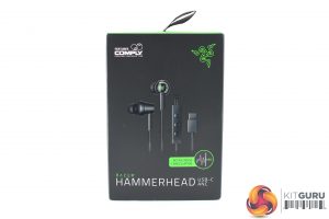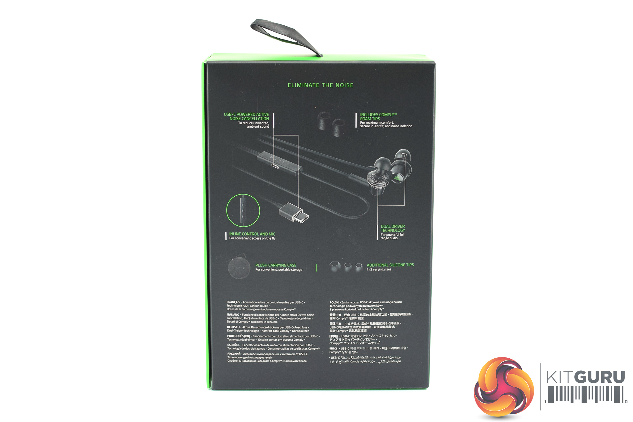 The Razer Hammerhead USB-C ANC ships in a black box, with a segmented image of the earphones visible on the front. The back of the box highlights various features of the earphones, including the in-line controller and included ear tips.