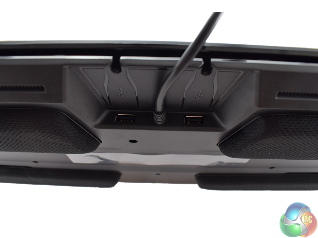 Finally, at the top of the board are two USB 2.0 ports for an extra peripheral such as a headset, as it is a given that one of the ports will be used by your mouse. The integrated keyboard cable is also visible, as the 4m cable attachment is detachable for ease of use.