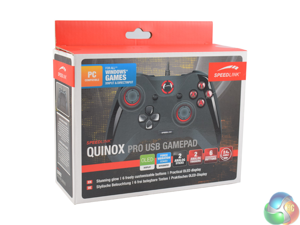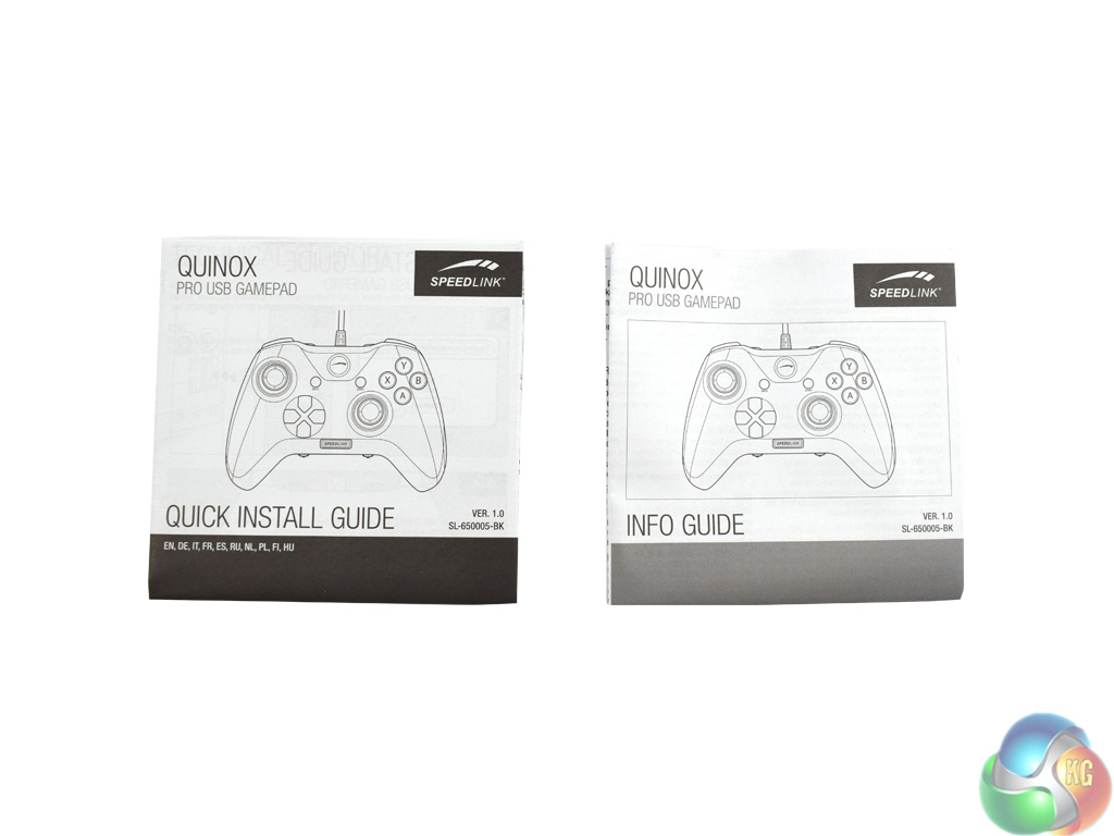 The SpeedLink Quinox ships in a colourful box. A large image of the gamepad itself dominates the front of box, while on the back we find multilingual specifications.