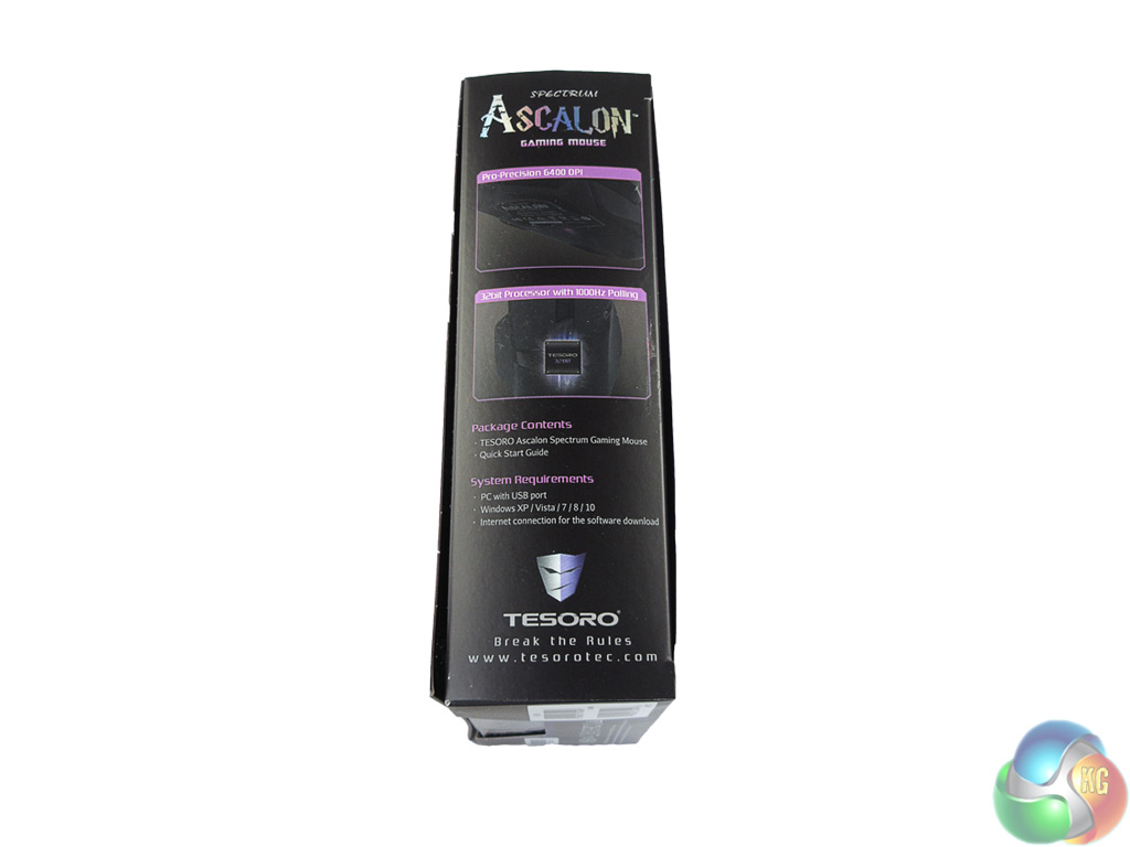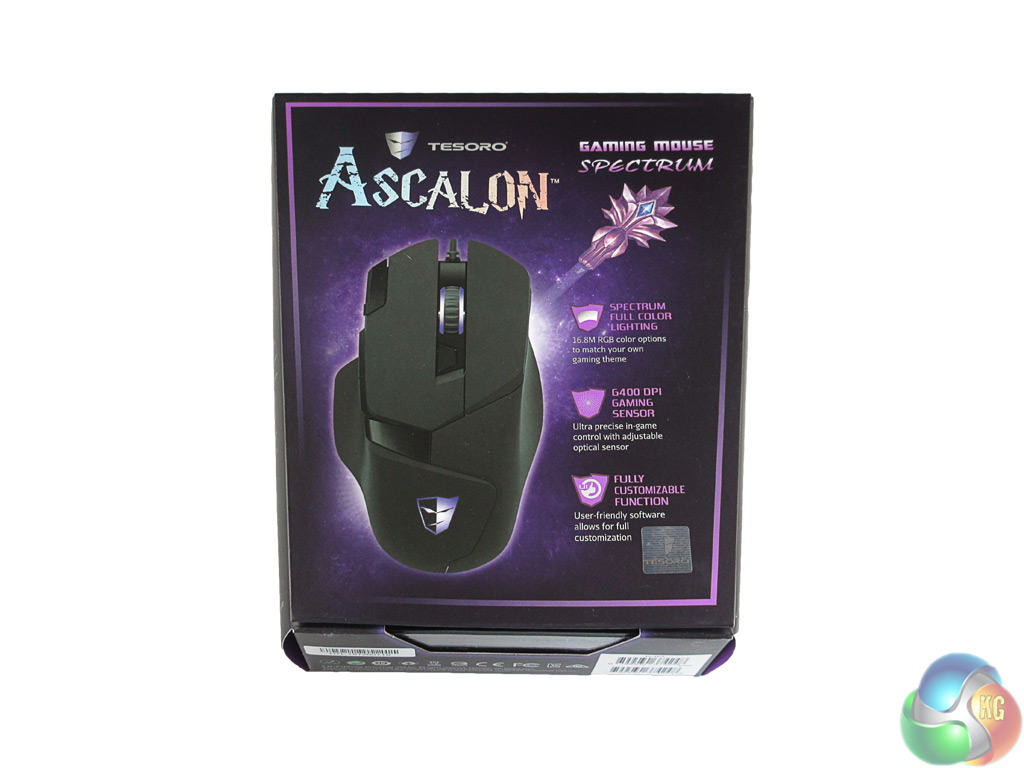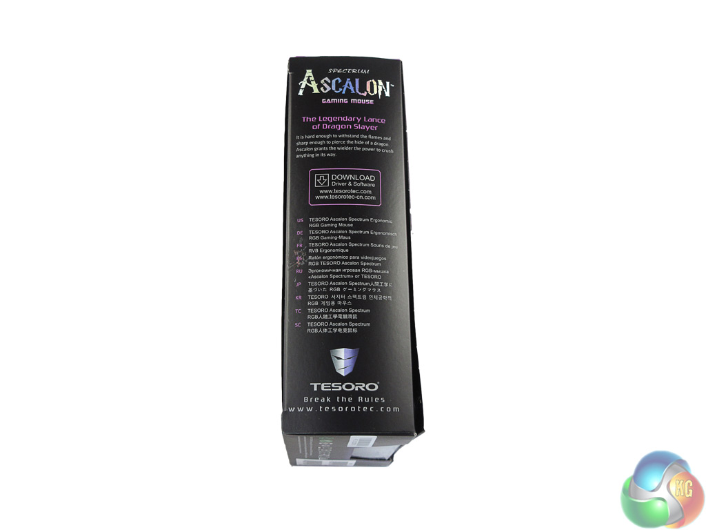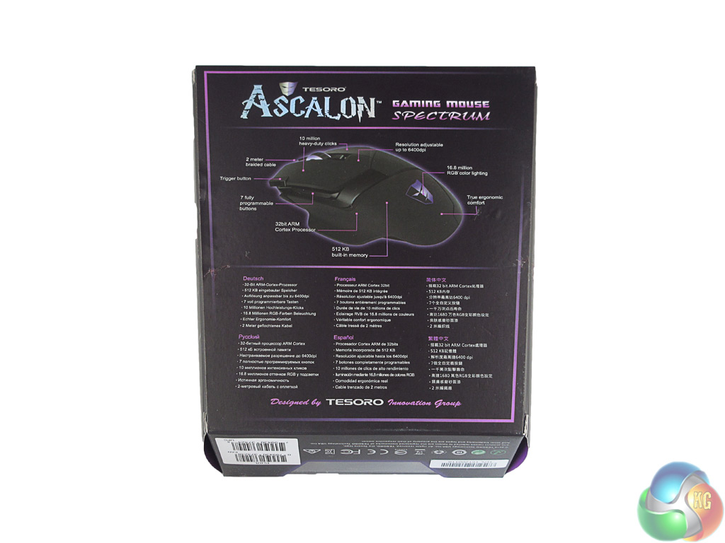 The Tesoro Ascalon ships in a fairly standard box, though the purple colour scheme does jump out at you. On the back of the box there is a labelled picture of the Ascalon, highlighting its key features.