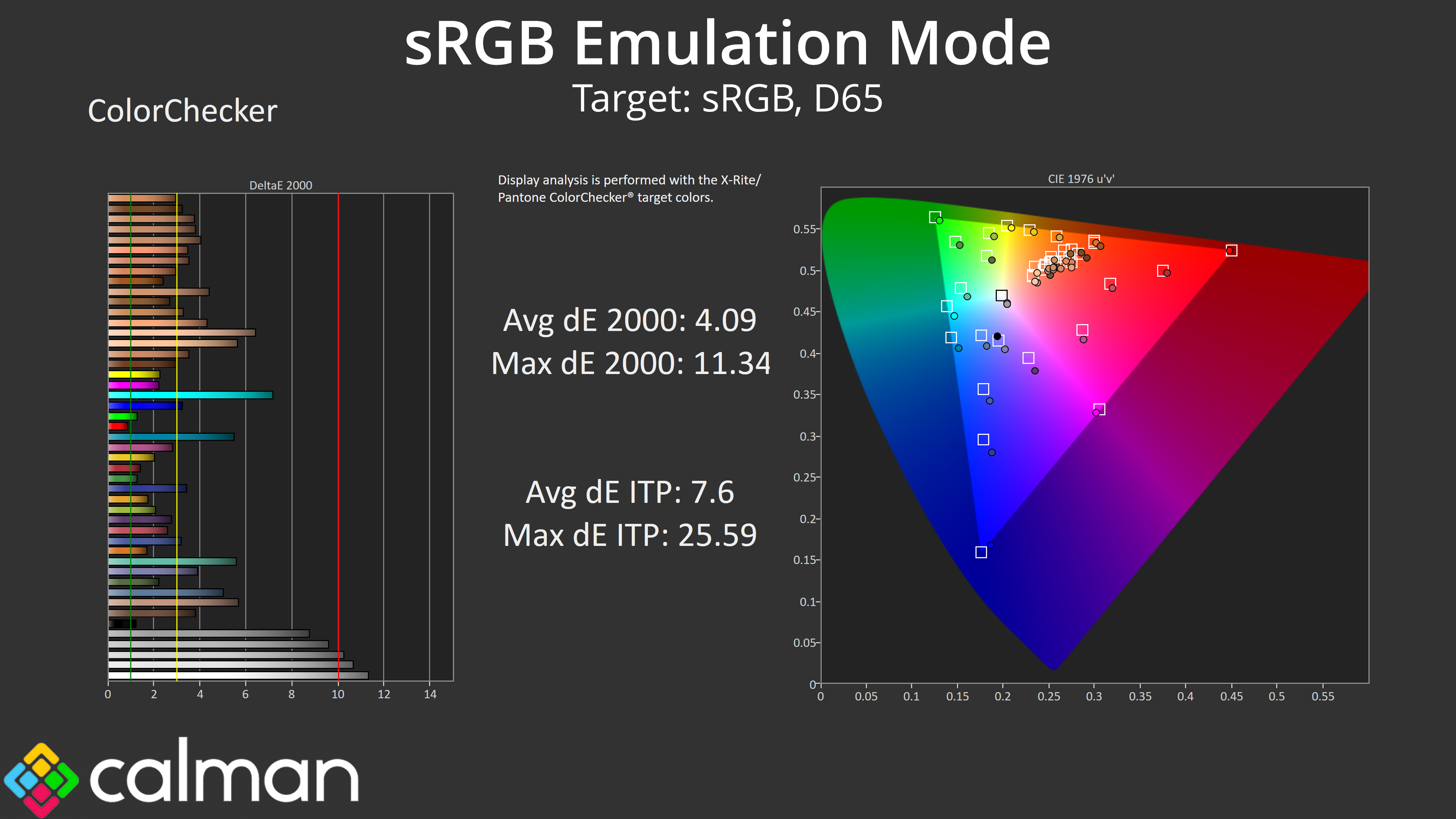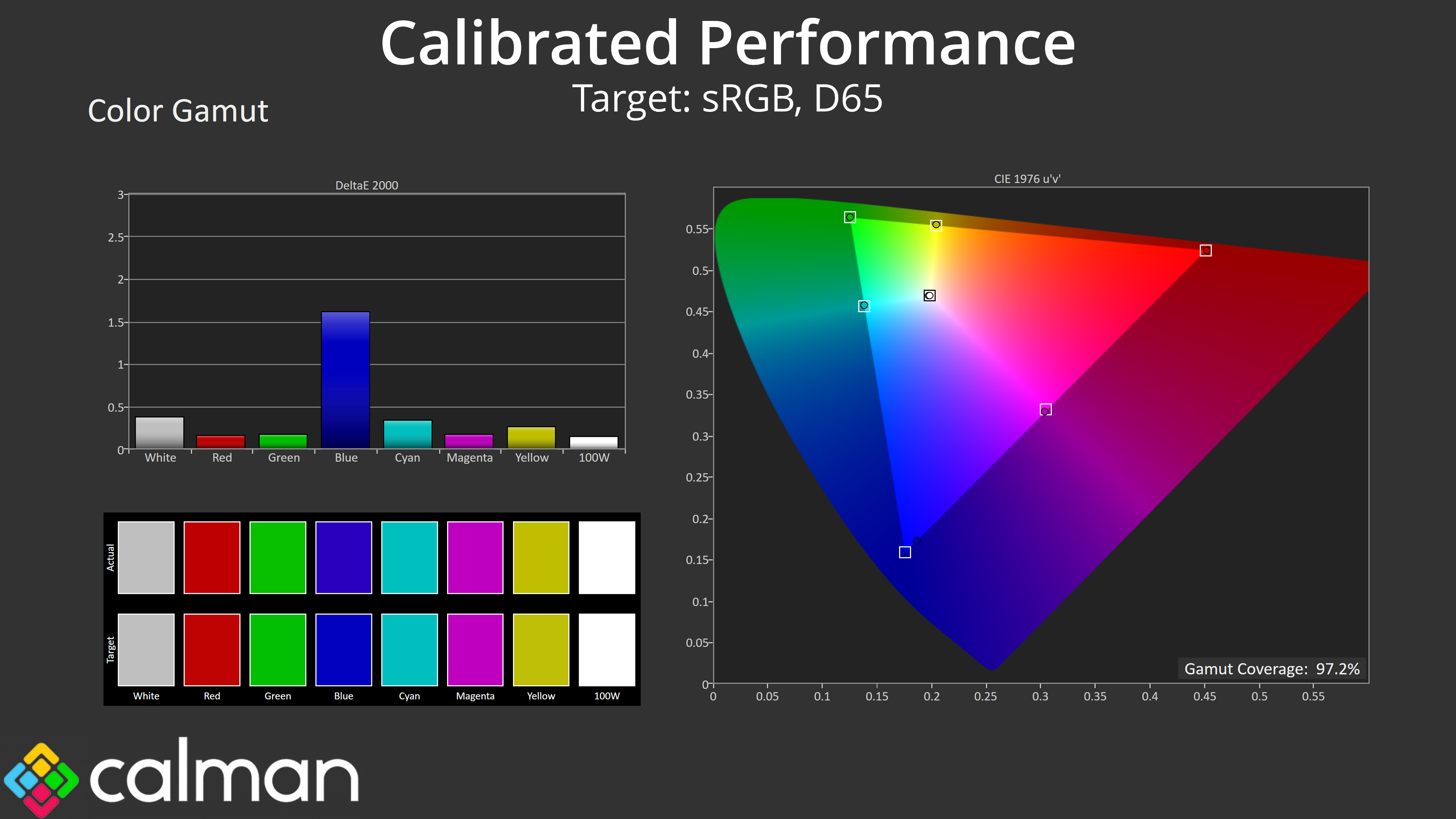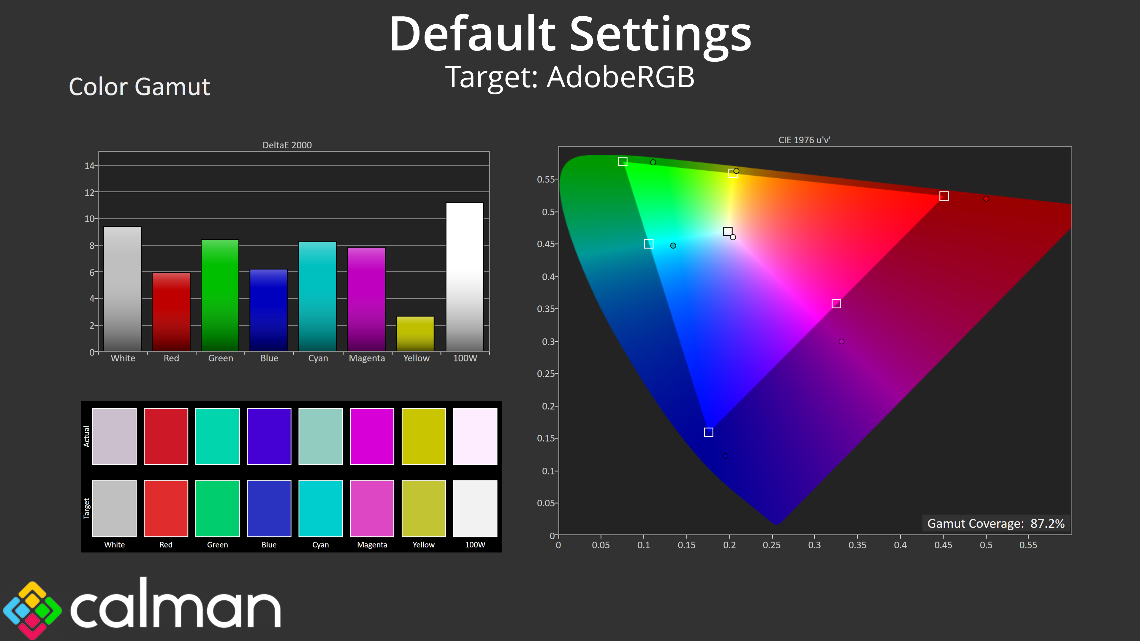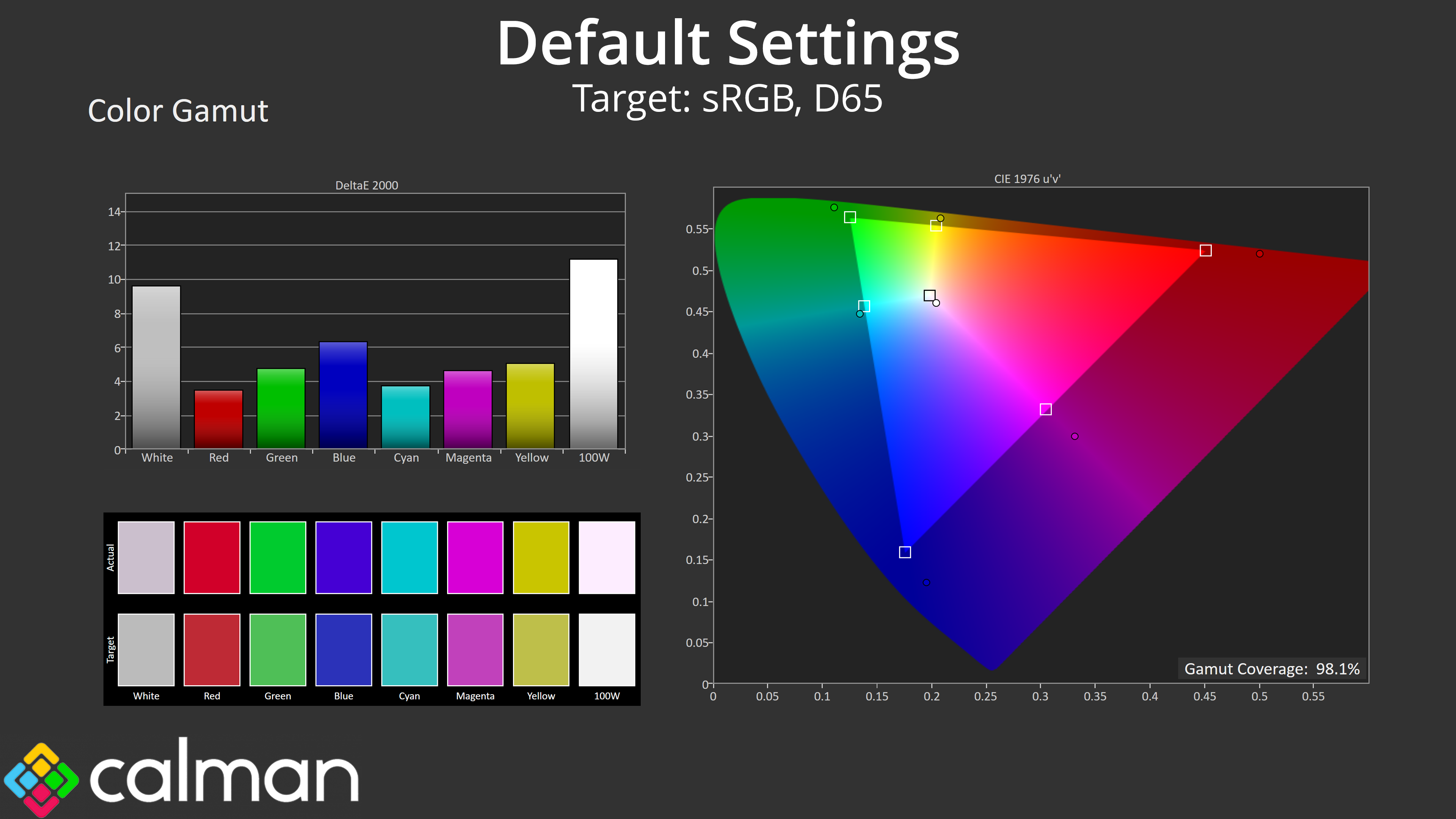 We first run these tests with the display in its out-of-the-box state, with all settings on default. If there is an sRGB emulation option or other useful mode then we may test that too. We then calibrate the screen using the Calman Ultimate software and run the tests again.
