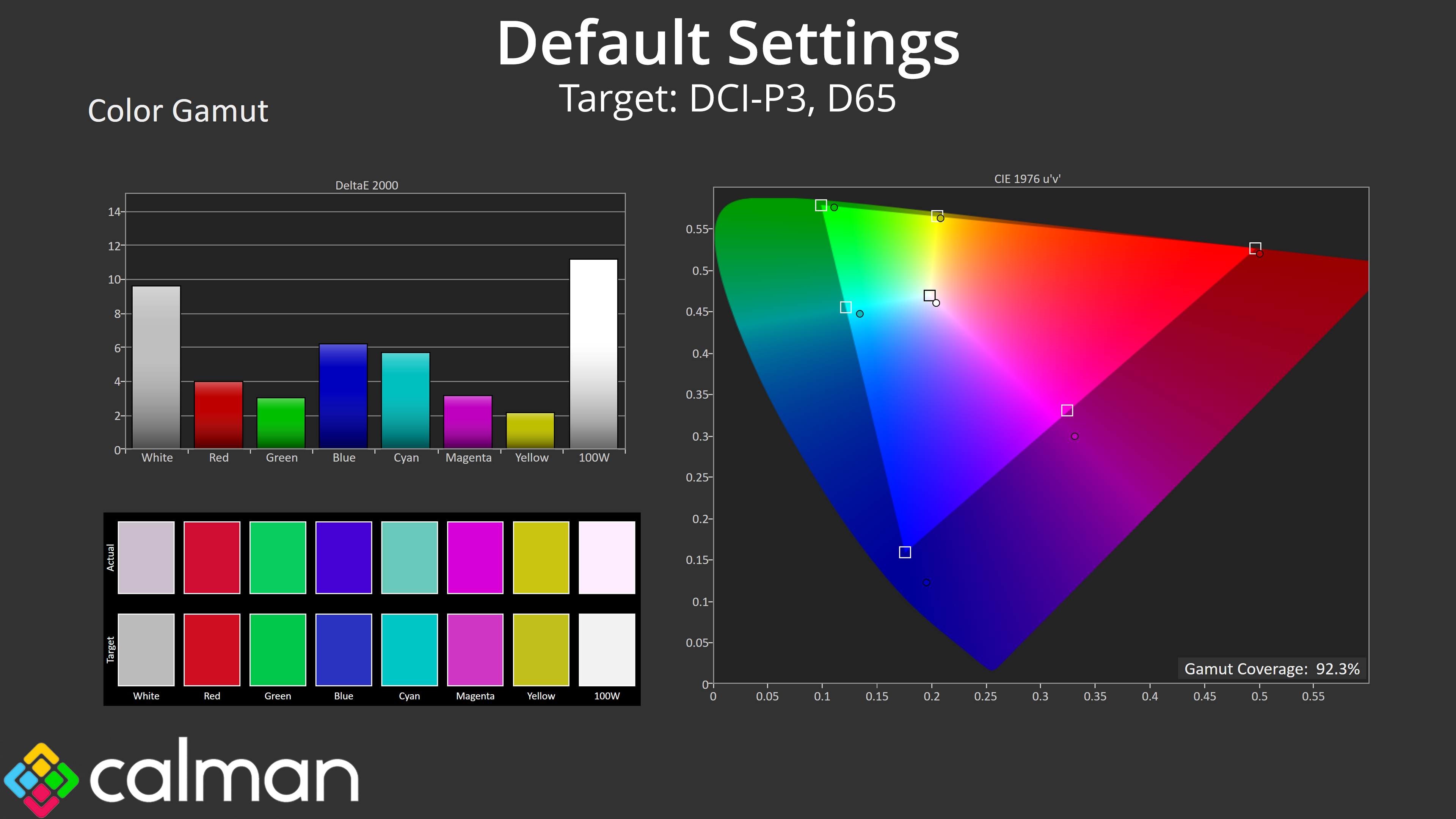 Gamut coverage is more as expected from this calibre of screen however, generally exceeding the sRGB space and hitting 92.3% DCI-P3 coverage, 87.2% AdobeRGB and then 74.7% reporting of the Rec.2020 colour space.