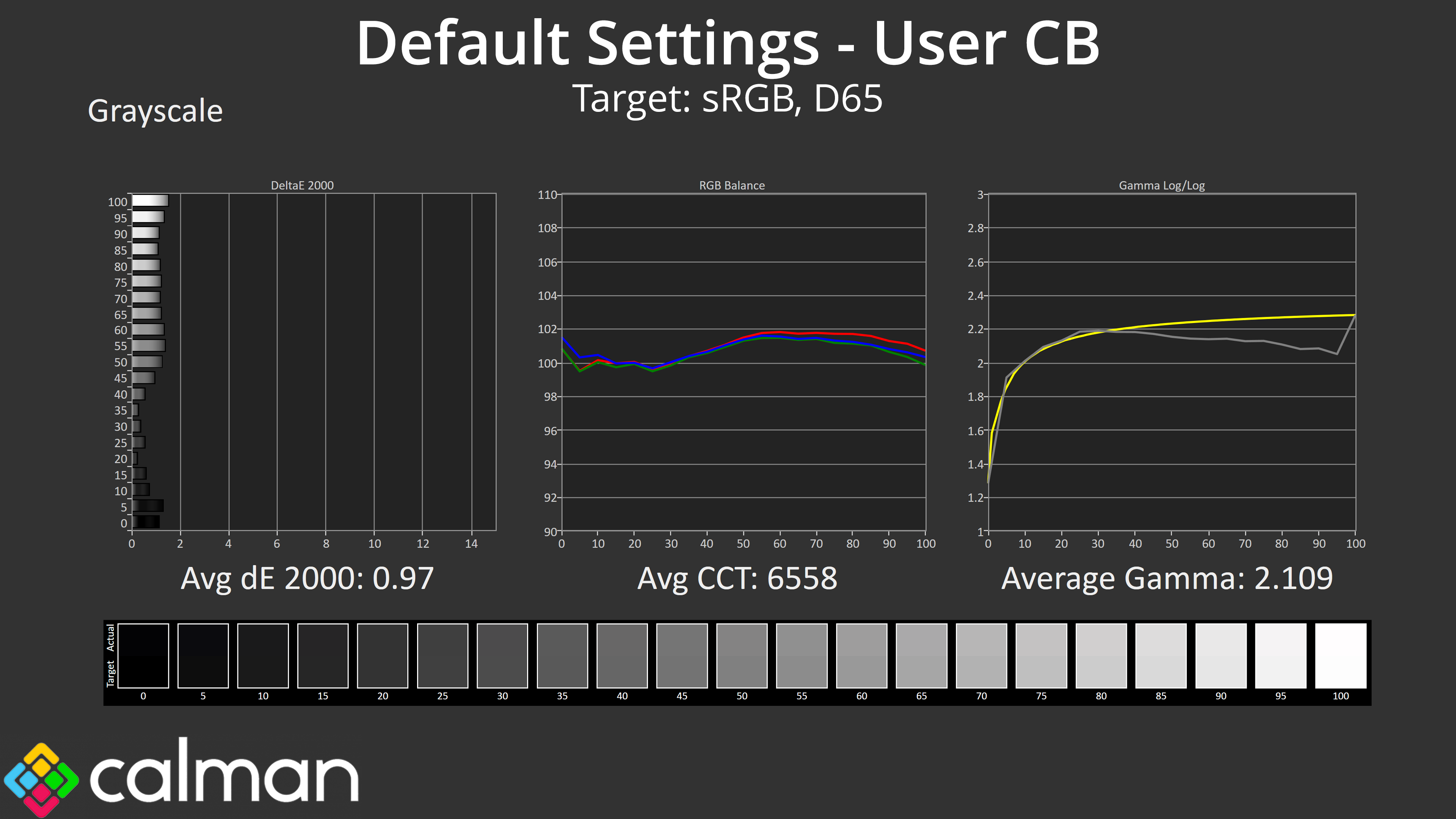 Thankfully, there is user adjustable colour balance and I dialled in the following settings – Red channel: 46, Green channel: 49 and Blue channel: 50. That improved things hugely, with a new average dE 2000 of just 0.97, and a near-perfect average CCT of 6558K. It's good that this option is available, but it's a shame the default presets are so inaccurate, as most users wouldn't have the necessary tools to accurately test any manual adjustments.