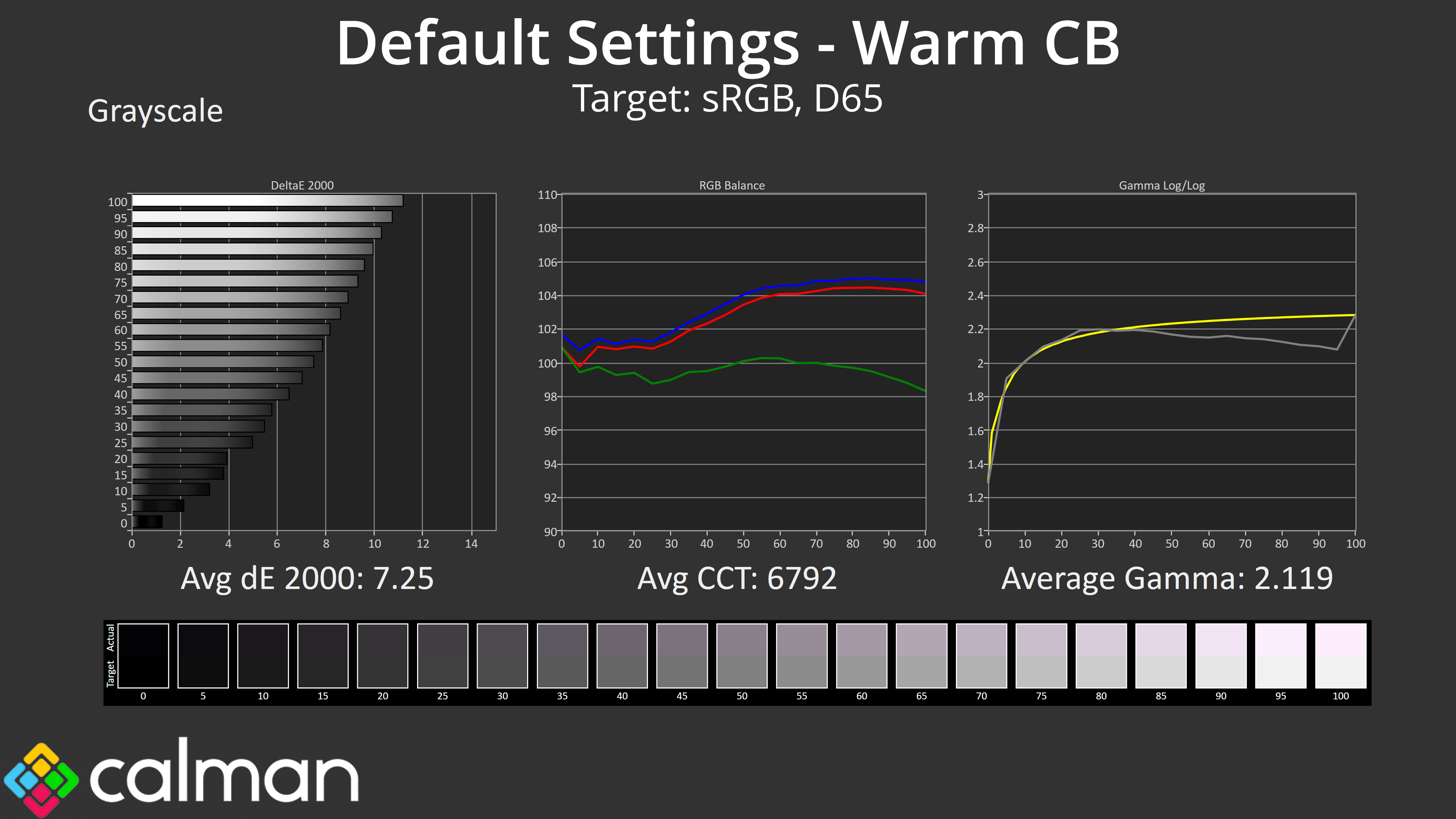 As for greyscale, we are starting using completely stock settings, and that includes the Warm colour balance mode. As you can see, greyscale deltaEs are alarmingly high as the colour balance is considerably out of whack. The average CCT (correlated colour temperature) of 6792K doesn't sound too bad, but the red and blue channels are raised significantly relative to the green channel, and that gives the screen a distinct pinkish/purpley hue.