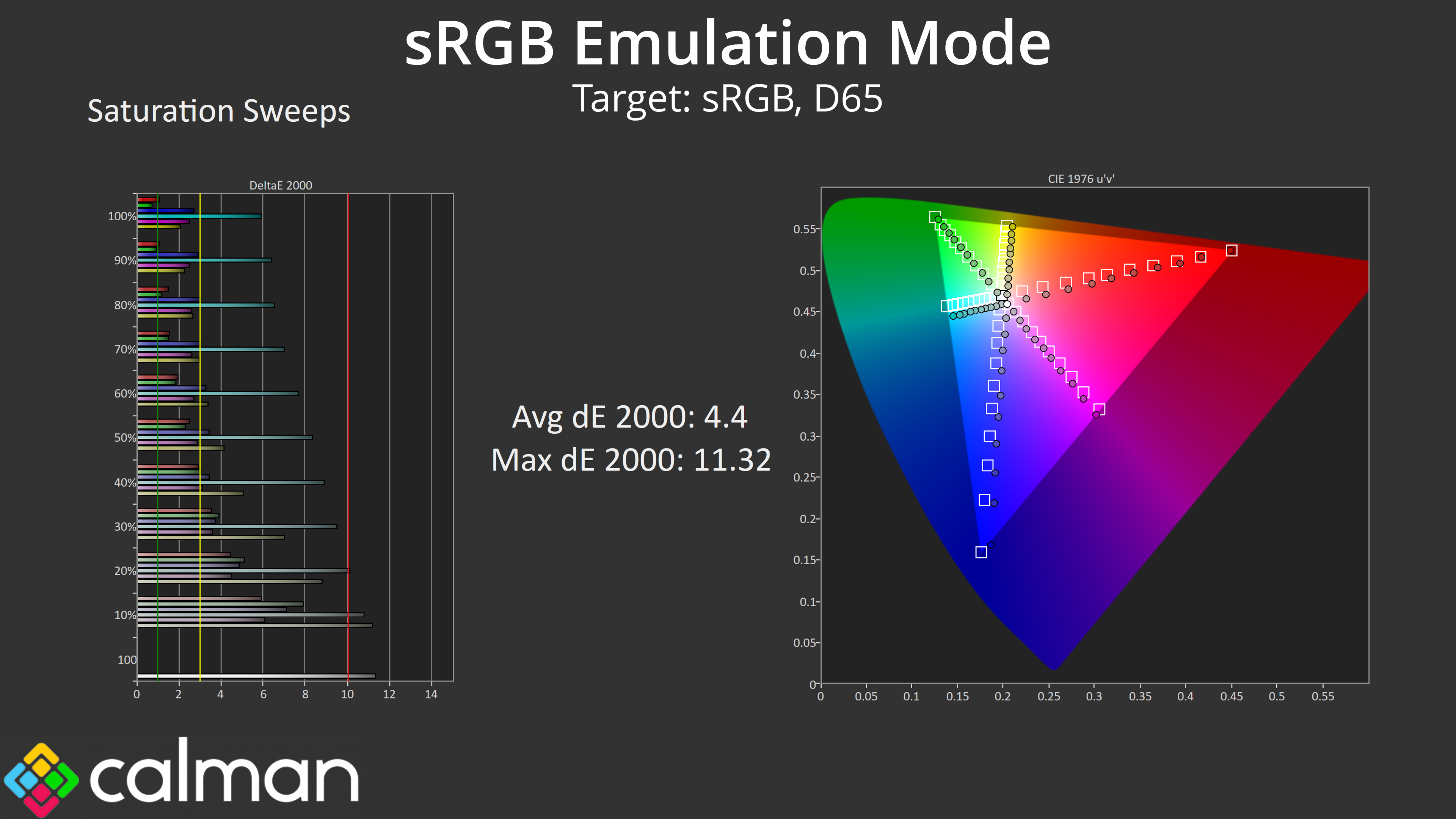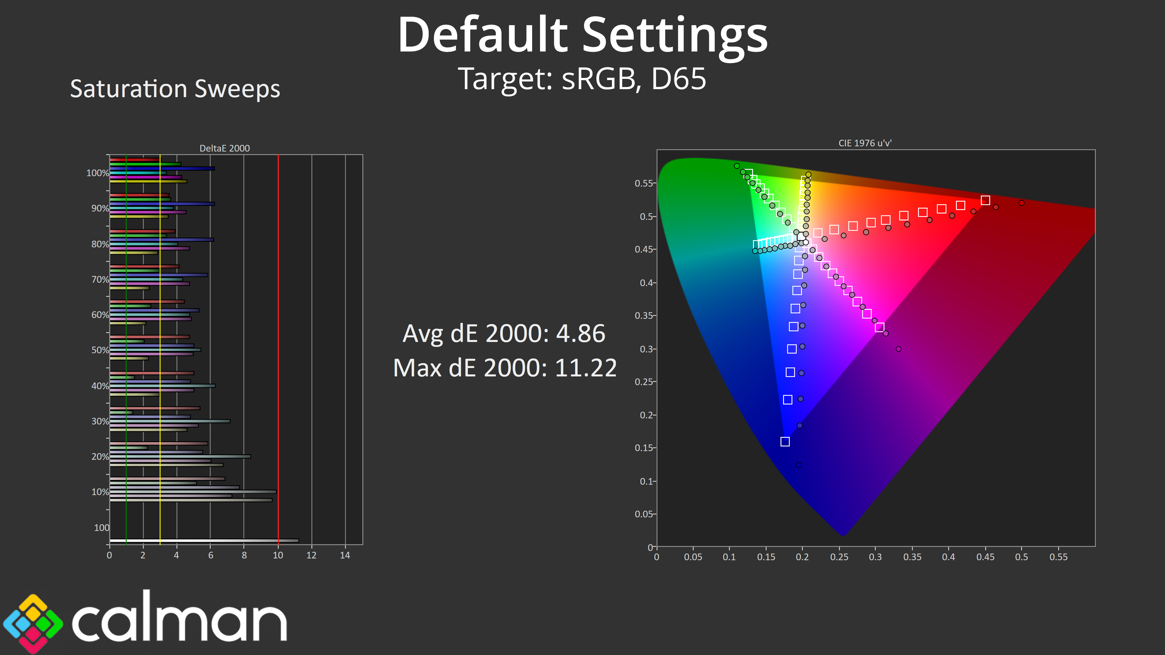 Next we come to saturation and we do see a fair amount of over-saturation here relative to the sRGB space, resulting in an average dE 2000 of 4.86.