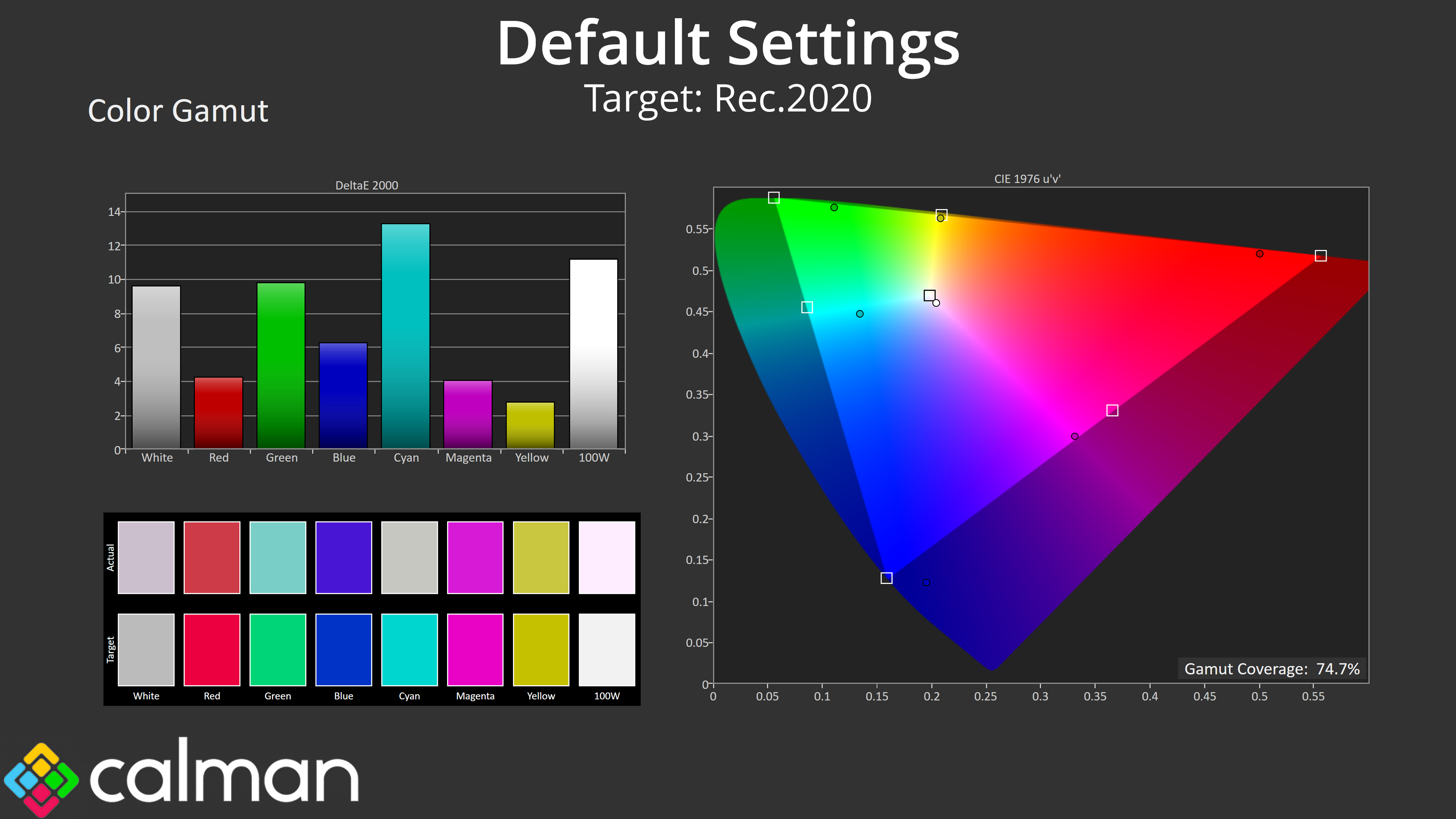 We did of course run through a full manual calibration using Calman Ultimate software. This fixed up all of our issues tremendously well, with near-perfect colour balance and gamma tracking. Saturation accuracy also improved to ridiculously good levels, as did our colour accuracy. The panel used here is clearly capable, it's just a shame the factory calibration – in particular the default colour balance presets – are lacklustre.