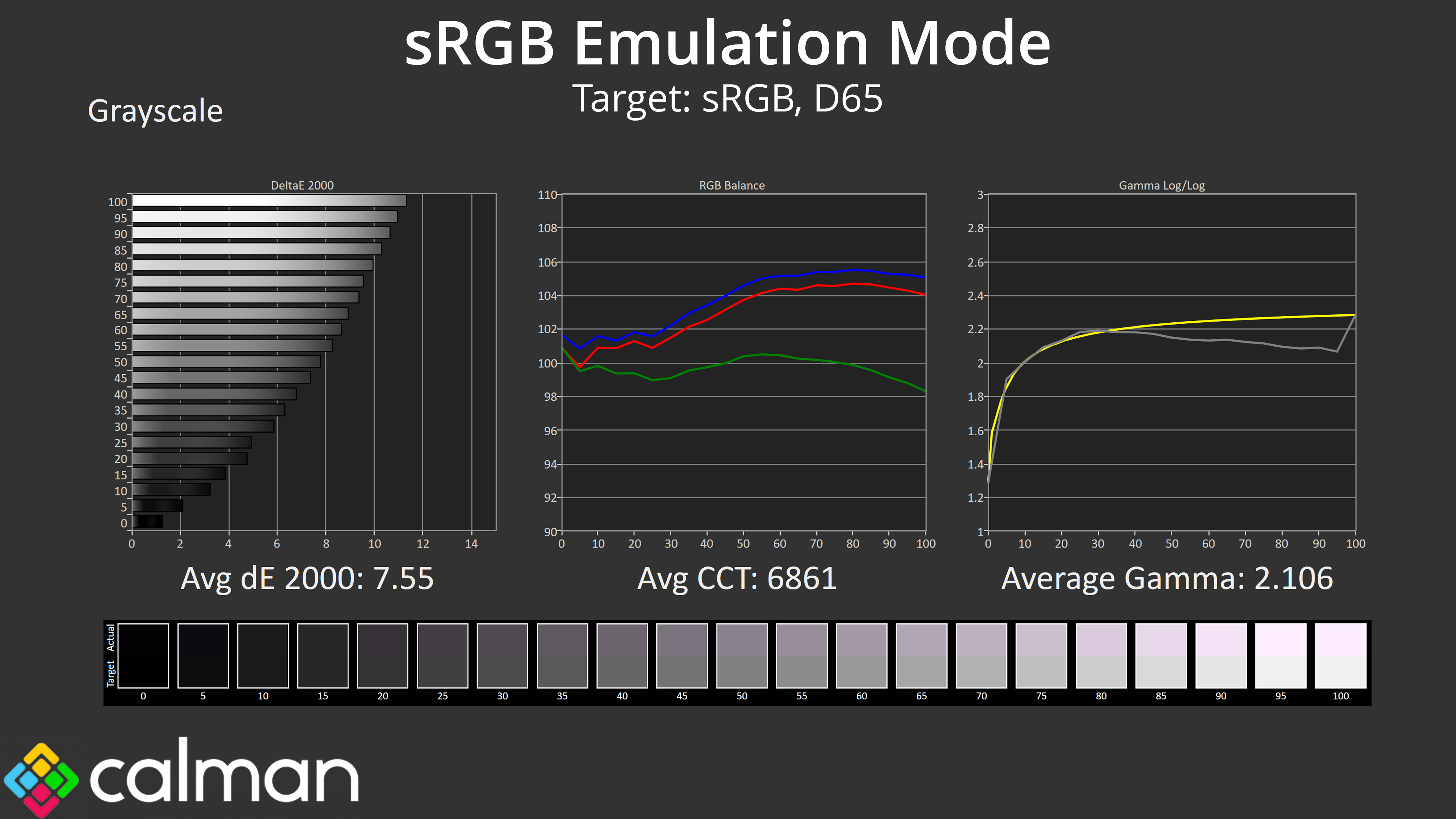 - Greyscale accuracy, measured across 20 shades, with an average colour balance reported.