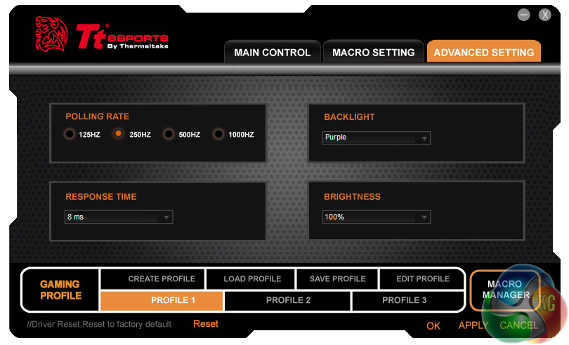Finally, there is the advanced page which gives users control over the polling rate of the keyboard, as well as backlight colour. It is important to note this is not an RGB keyboard, and users can choose between red, purple and blue backlight options. Backlight brightness can be adjusted via the software, but there is also a physical brightness dial on the keyboard itself.