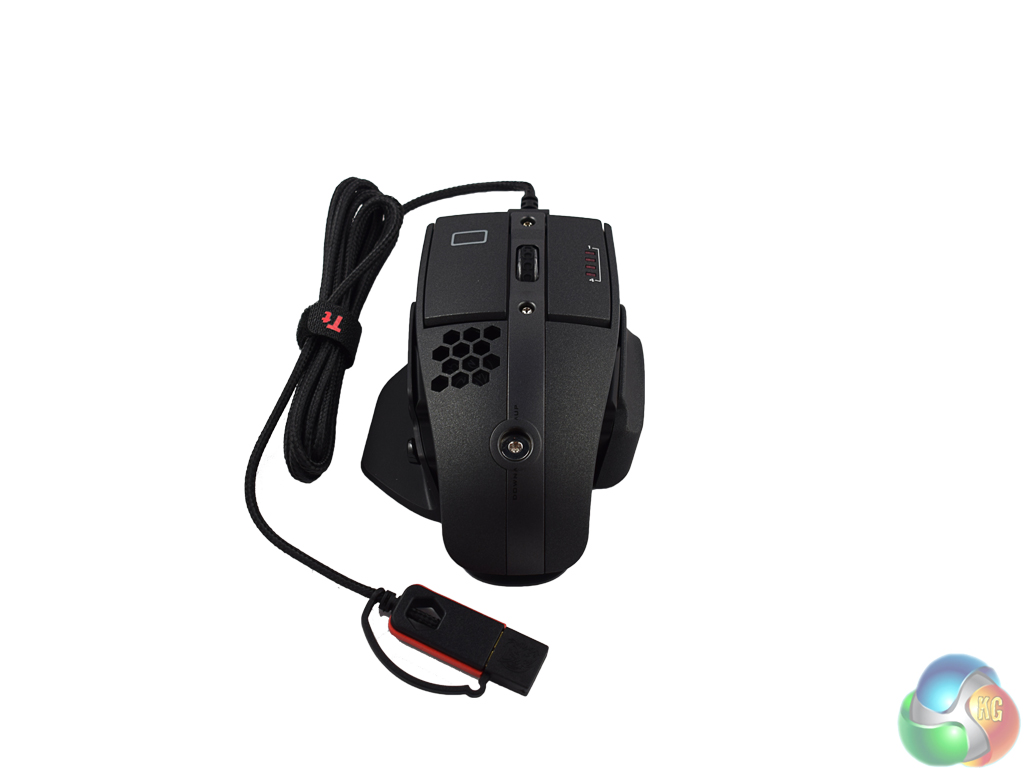 Below the left button is a honeycomb mesh – underneath which the Tt eSports logo is visible. This is the third of the 3 RGB lighting zones.