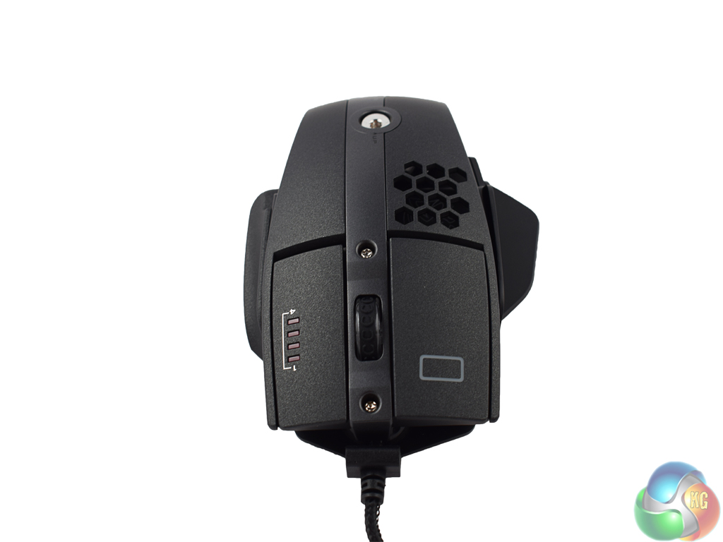 While we are here, a small rectangle is visible on the left mouse button. This is one of 3 RGB lighting zones, while the mouse wheel acts as another. The right mouse button also features four smaller LED indicators which tell you the DPI stage you are currently using.