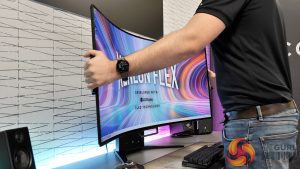 We mean that quite literally, as the monitor physically bends when you pull on the handles positioned on the left and right side. It is adjustable from being completely flat, out to an impressive 800R curvature. Right now, there's three intermediate steps between flat and 800R, but Corsair tells us they are still fine-tuning the mechanism, as we saw a fairly early prototype.