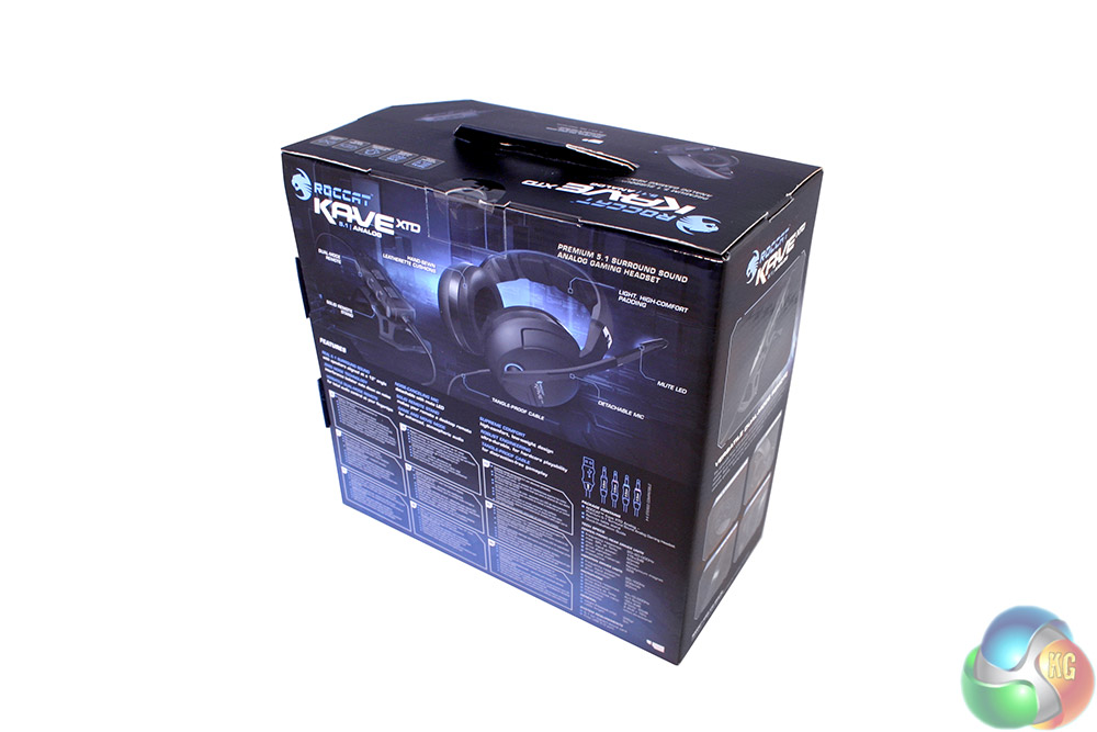 The packaging for the Roccat Kave XTD 5.1 analogue is of the sort of quality you would expect from Roccat. It ditches product photography on the front and instead gives you a big clear plastic window to look at the actual headset through. There are also a few highlighted features such as comfort boosting foam and the fact that it has full 5.1 surround sound capabilities.