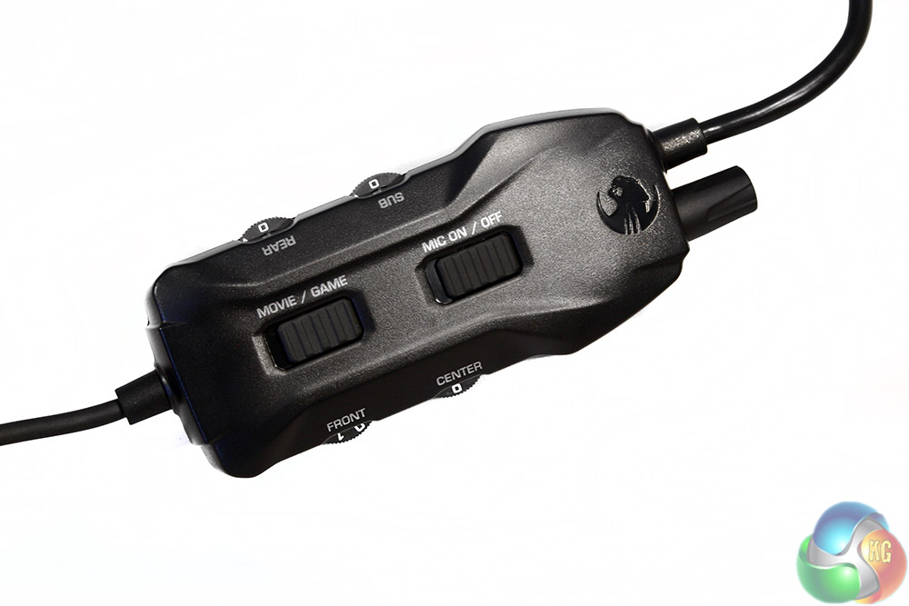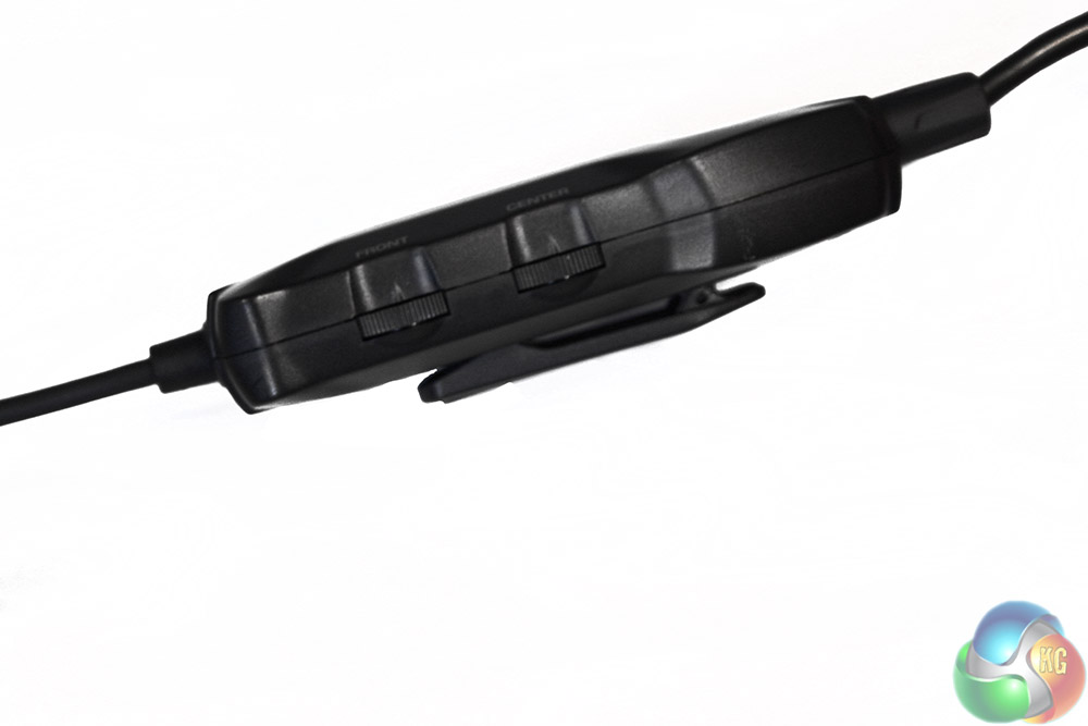 The volume control is quite a chunky piece of plastic and features a lot of different controls. Not only is there an on/off and volume dial on the end, but there are two switches: one for microphone muting (or not) and one that changes your mode from movie to game and back. There are also different volume controls for each of the surround sound channels.