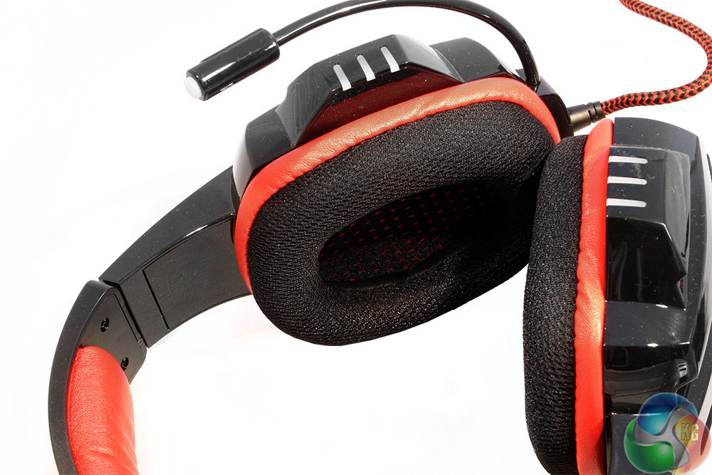 At the top end you have the full adjustable headband which should fit most heads without too much difficulty. I have an above average head for a man of my size and it sat against my ears without difficulty so you're unlikely to have any other issues. In the middle of the band is a comfortable red leather cushion that does a good job of protecting your skull during long gaming sessions.