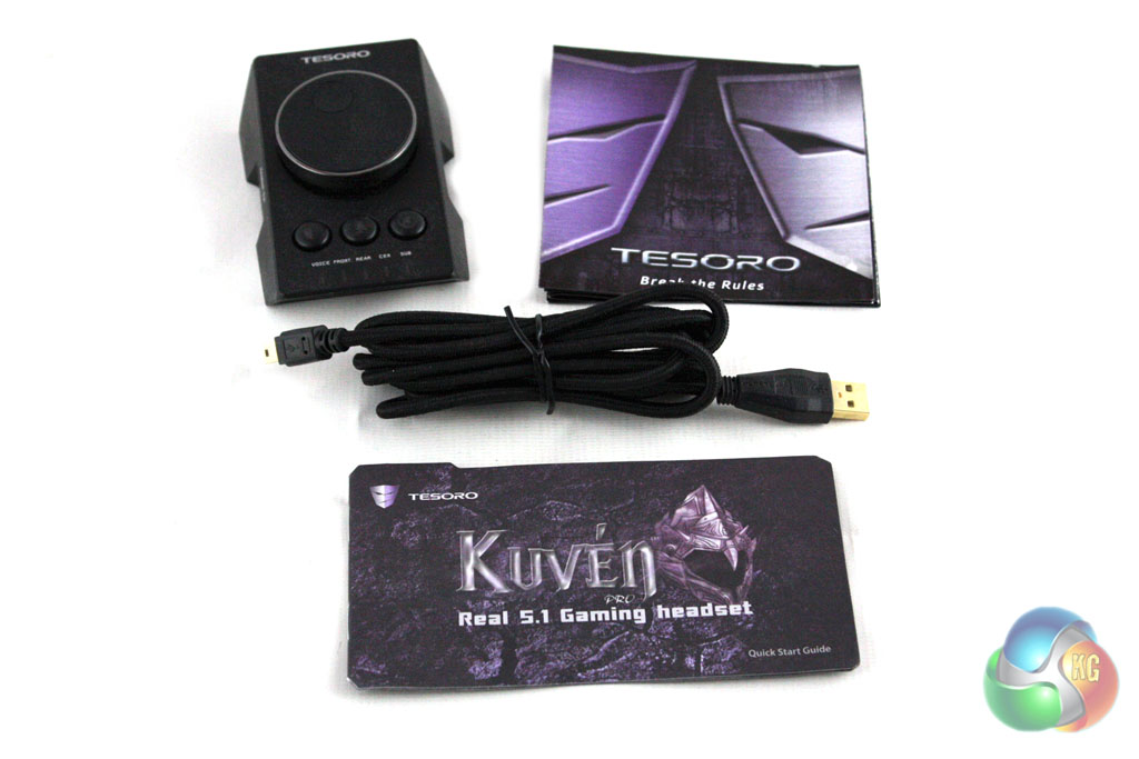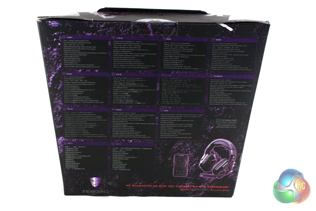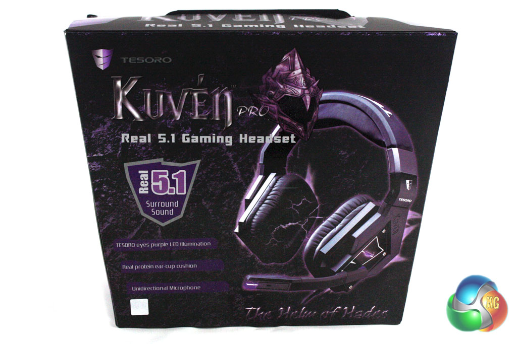 The Tesoro Kuven Pro is supplied in a rather unusual trapezoid shaped box. It is decorated in a purple and black livery, with the front featuring a large image of the headset which we find within.