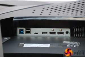 The CG437K is positively bristling with ports. Facing downwards, there's the USB 3.0 upstream plus two Type A downstream ports and USB C. The latter can deliver 30W of power and act as DP Alt video and data upstream, so could charge an attached laptop if needed. Then there is a single HDMI 2.0 and two DisplayPort 1.4, with an analog audio minijack next along. On the other side of the power input can be found the header sockets for the four LED lighting strips, assuming you've figured out where to put them.
