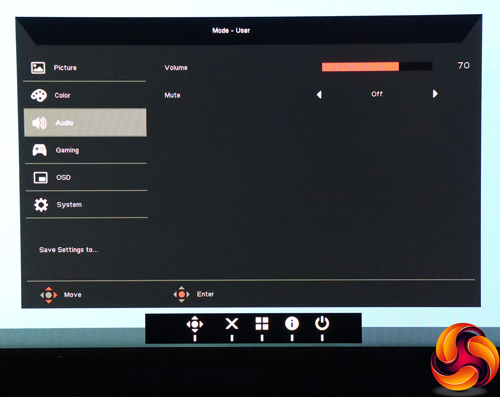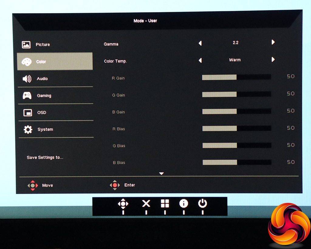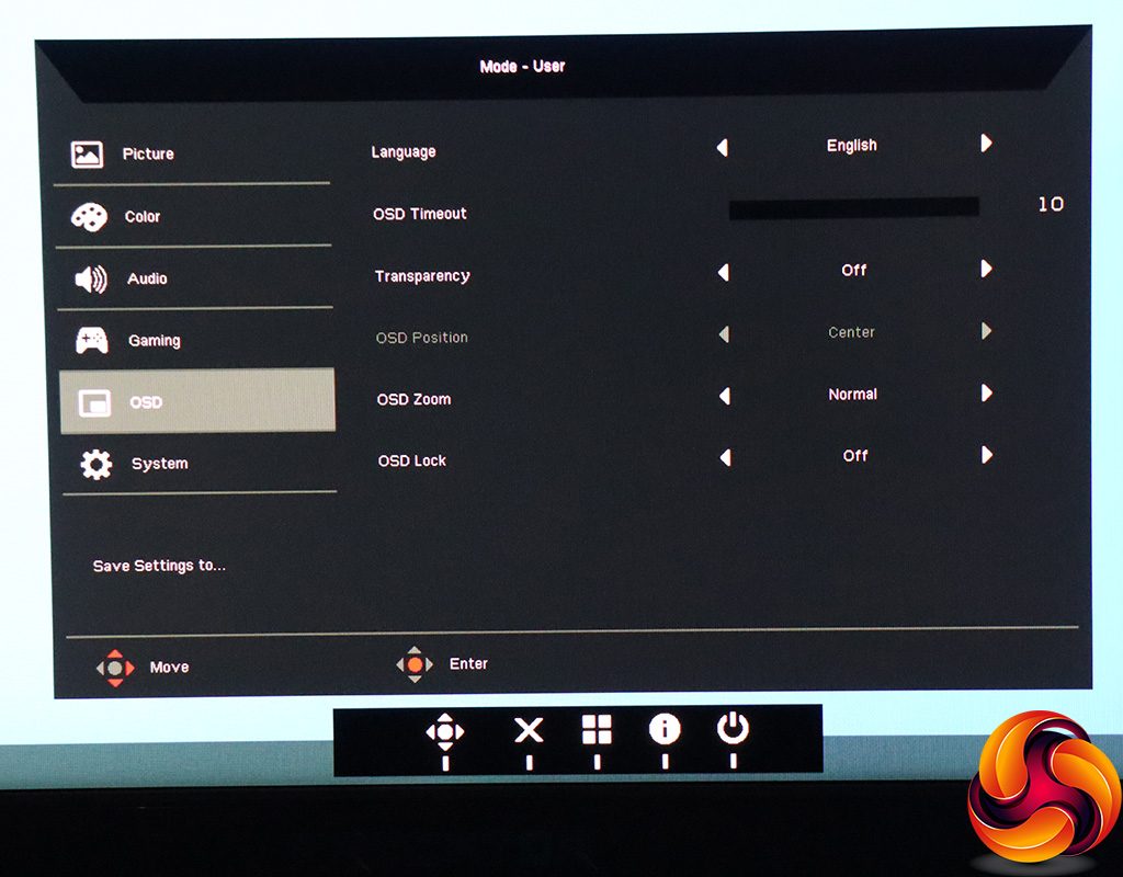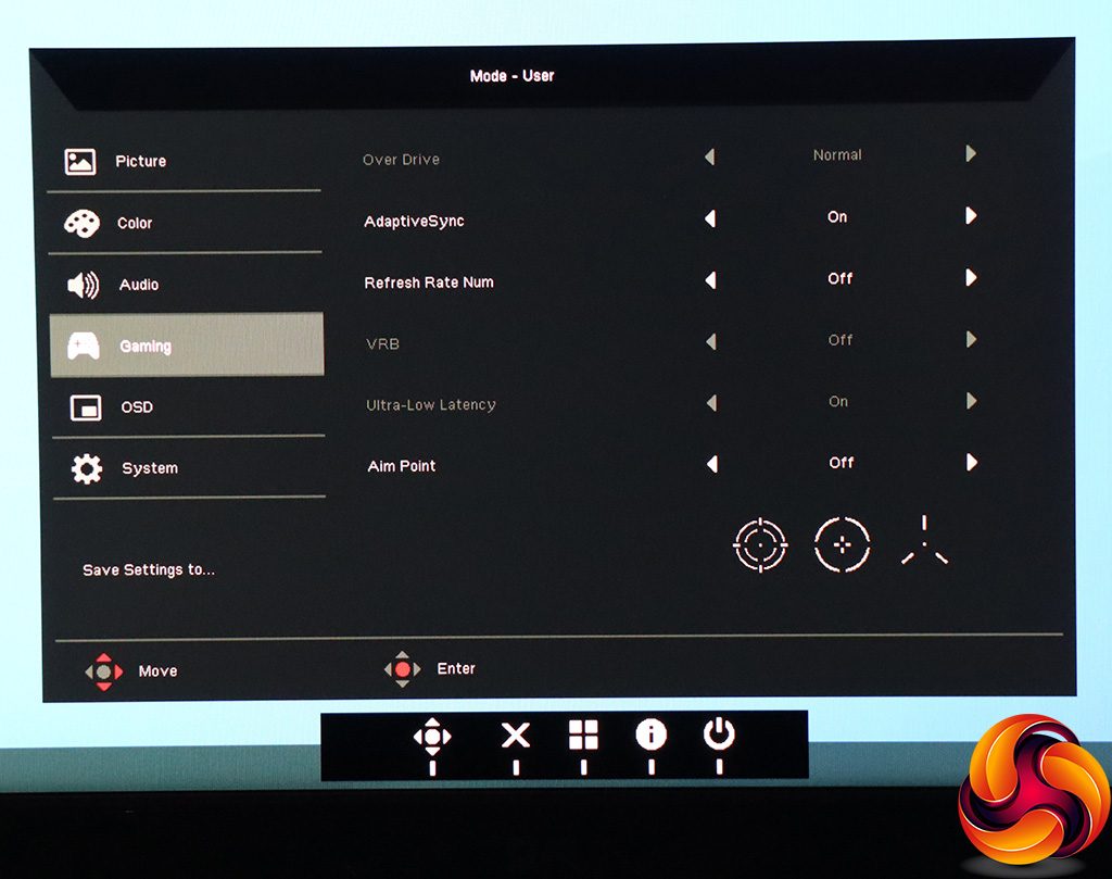 Being a gaming monitor, there is of course a section full of settings aimed at this particular activity. You can enable Over Drive, if your connection type supports it, and similarly turn on Adaptive Sync (which enables FreeSync or G-Sync, depending on the graphics card used). Refresh Rate Num shows the current refresh onscreen, which acts as a FPS counter with adaptive sync. The VRB function, as mentioned earlier, is a pixel overdrive that enables the 1ms response time in a VA panel that doesn't natively support this. Ultra-Low Latency can only be disabled if you're not in adaptive sync mode. Finally, Aim Point lets you place different crosshair types onscreen.