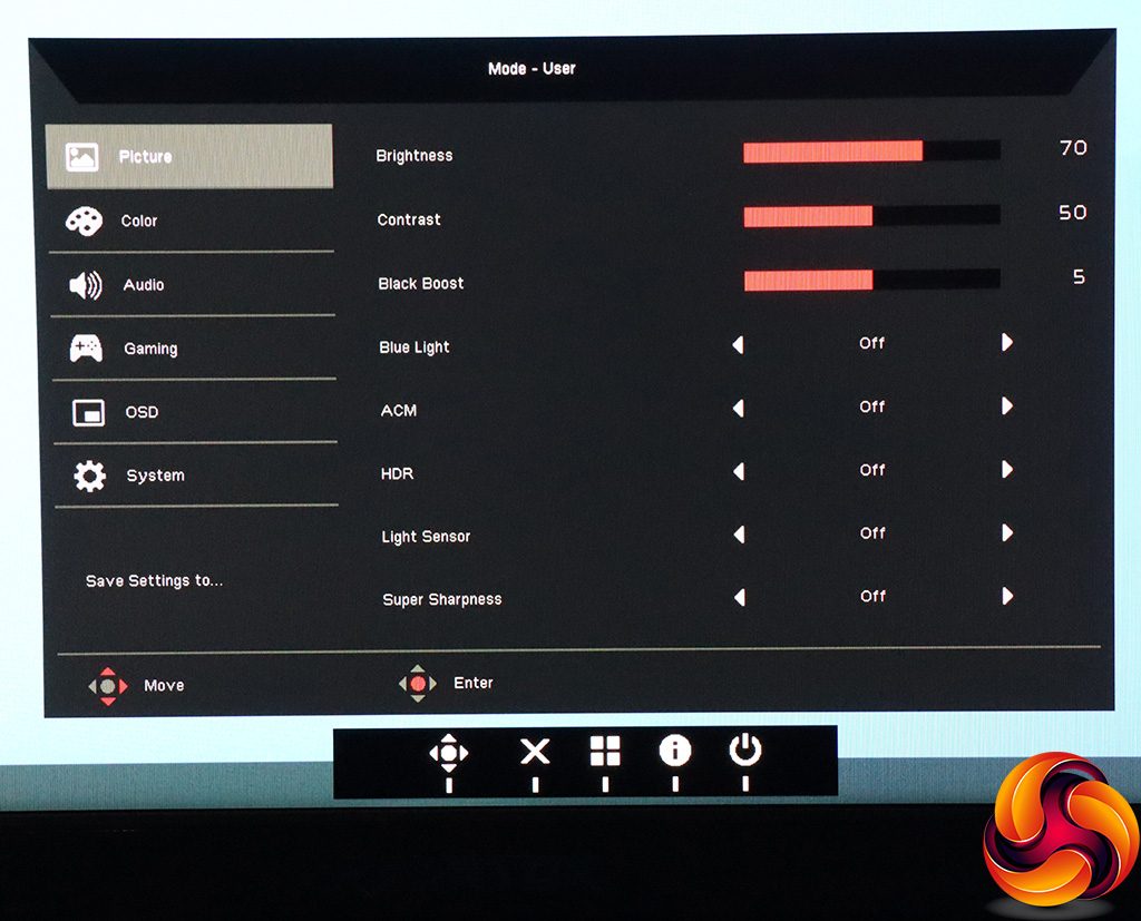 Pushing the joystick in calls up the main menu, with the Picture section being the default. Here you can control brightness, contrast and black boost. There's an eye-saving Blue Light mode, which has four options as well as the default Off position. You can turn on ACM dynamic contrast and HDR, which we mentioned earlier supports the DisplayHDR 1000 standard. The Light Sensor has three options, and lets the monitor control its brightness automatically depending on the illumination conditions it detects, although it's not available in all colour space modes. Finally, the Super Sharpness option simulates extra detail in lower-resolution images.