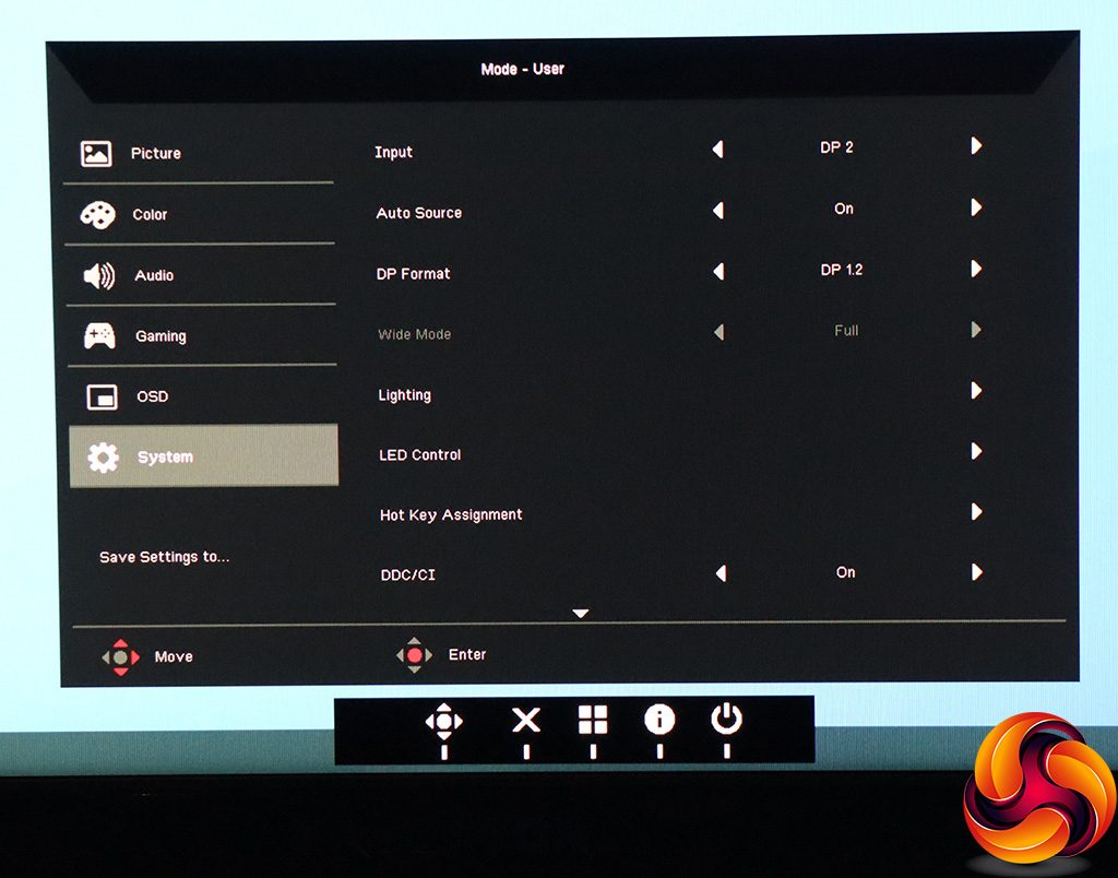 The System section contains all the sundry settings that don't fit elsewhere. You can manually change the input here, and also toggle auto source detection. You can change the DisplayPort mode from 1.4 to 1.2 or 1.1, if your graphics card is having trouble with one of the more recent standards. Wide Mode lets you select how non-native resolution signals are displayed, including 1:1 or 21:9 options.