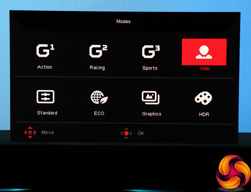 The first button moving left from the power button calls up the Modes presets, which include Standard, ECO, Graphics, and HDR, plus Action, Racing and Sports games modes and a user-configurable option.