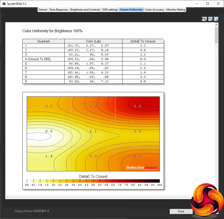 The CG437K is undeniably the brightest monitor we have ever tested, hitting 843.5cd/m2 at its highest level. The contrast is also pretty amazing, reaching 2,520:1 at 100 per cent brightness. The white point does vary a little from 6700K at zero brightness to 7000K at 100 per cent. It's also worth pointing out that this monitor never really gets that dark, returning 112.8cd/m2 even with the brightness turned all the way down.