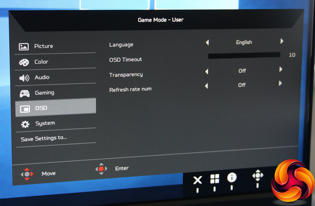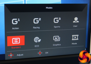 Selecting the left-most button calls up the OSD preset modes. There are three modes for gaming – Action, Racing and Sports – plus a User-configurable option. For more work-focused and everyday activities, there is a Standard mode, plus ECO, Graphics and Movie. So the most usual monitor functions are covered.