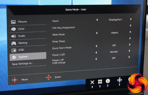 The System menu includes sundry settings, such as whether the USB ports will still supply power for charging attached devices when the monitor is off.