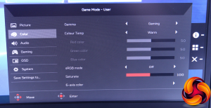The Color menu offers a wide variety of controls over how the monitor presents its chromatics. The Gamma setting, curiously, offers options of 1.9, 2.2, 2.5 and a mysterious Gaming mode. Alternatively, Warm, Cool or Normal Colour Temperature options are available, as well as individual adjustment of red, green and blue, and there's Saturation control on hand as well.