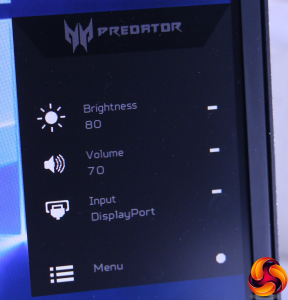 Press any of the buttons on the rear, other than the power button, or push the joystick, and this quick menu appears. By default, it provides access to adjustment of brightness, the volume of the built-in speakers, and toggling between the inputs. These are then adjusted with the joystick. However, press the joystick again and the main menu appears instead.
