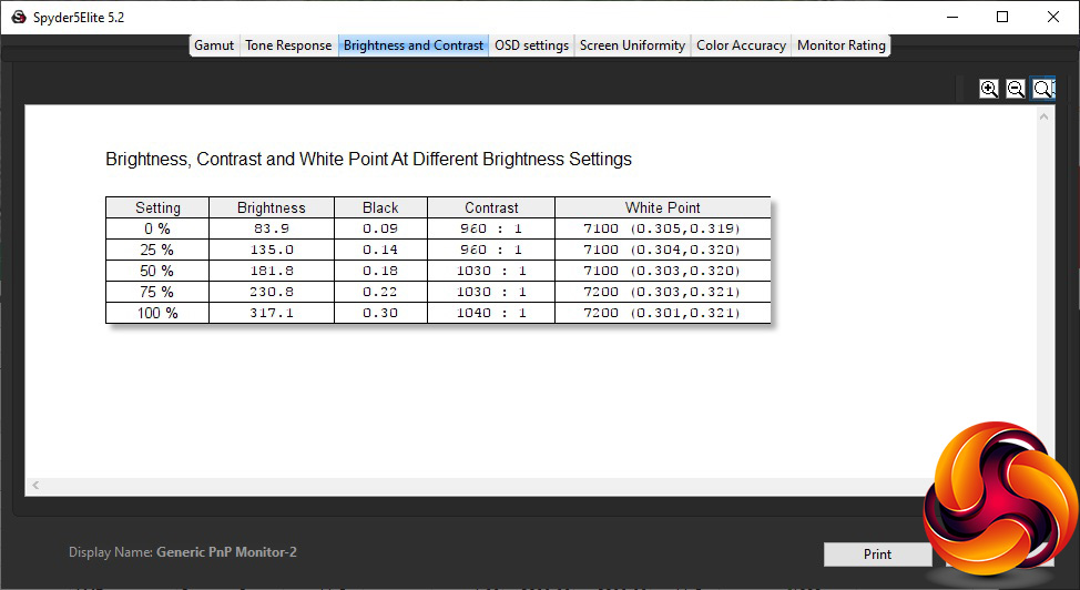 - A monitor’s contrast ratio at various brightness levels in the OSD.