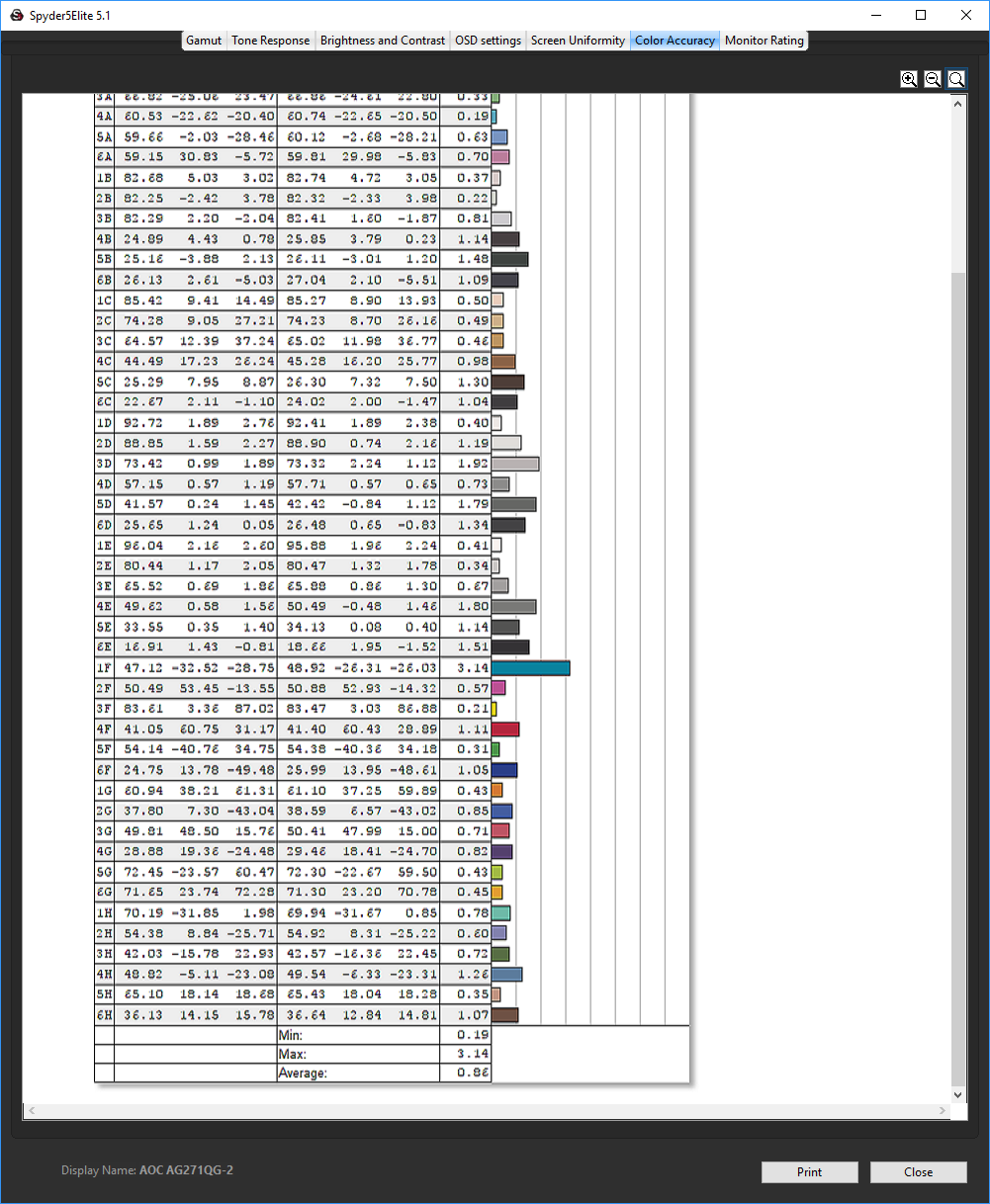 Colour fidelity is where IPS panels really pull away from their TN competitors, and without any calibration the AG271QG is much more faithful than the AG271QX, and indeed very good overall with a score of 1.02.