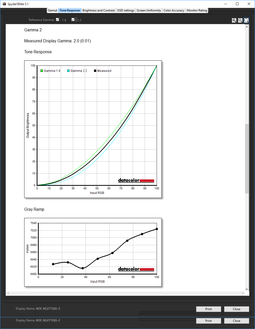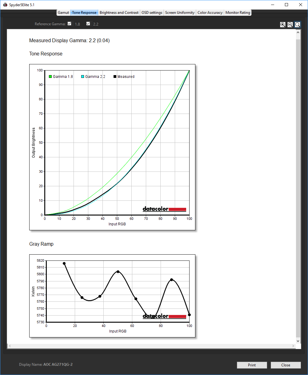 Contrast is also very stable across the board, hitting 860:1 at 50 per cent brightness and above, and only dropping to 770:1 at 25 per cent brightness. The white point is also pretty stable across the brightness range, although the AG271QX was a total master in this area, with variance only at maximum brightness. Note that the default brightness for the AG271QG is 90 per cent, which seems unnecessarily high after seeing the results of this test.