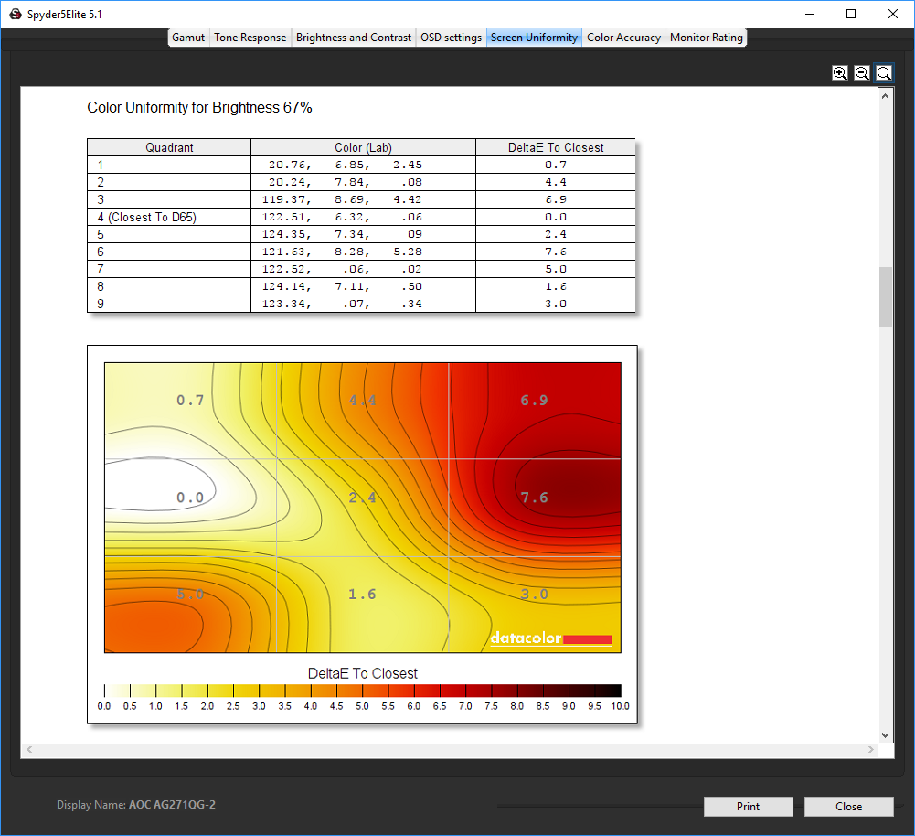 The first surprise comes with the brightness uniformity. We had heard rumours that there were issues in this area with the IPS panel used in the AG271QG, and this bears those rumours out, with a lot of variation in the top third, down the left and right sides, and in the bottom left corner. These results are notably behind the TN-based AG271QX.