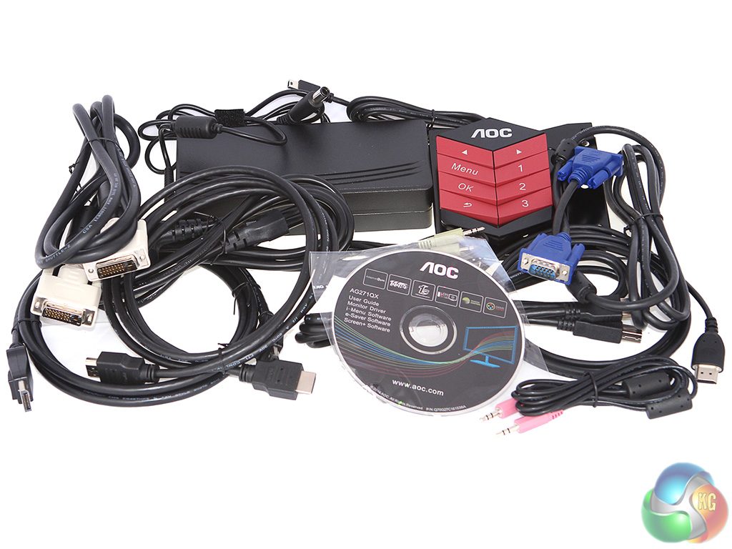 The AGON AG271QX includes an external power supply, plus cables for pretty much every connection: DisplayPort, HDMI, HDMI to MicroHDMI, plus even VGA and DVI. There are minijack cables to route line and microphone to the monitor, plus one for the USB 3.0 hub.
