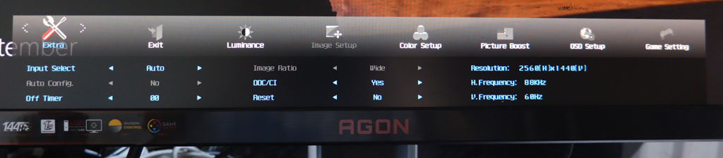 The final Extra OSD menu section is where AOC has thrown everything that didn't fit elsewhere. You can choose whether the screen reacts to inputs automatically or defaults to one in particular. There's a timer so that the screen will turn off a certain period of usage. You can turn DDC/CI off or on. This is the system whereby certain features of the monitor can be controlled directly from inside Windows, such as brightness, contrast and colour. You can also reset everything to default settings and get a readout of the current display resolution and frequency settings.