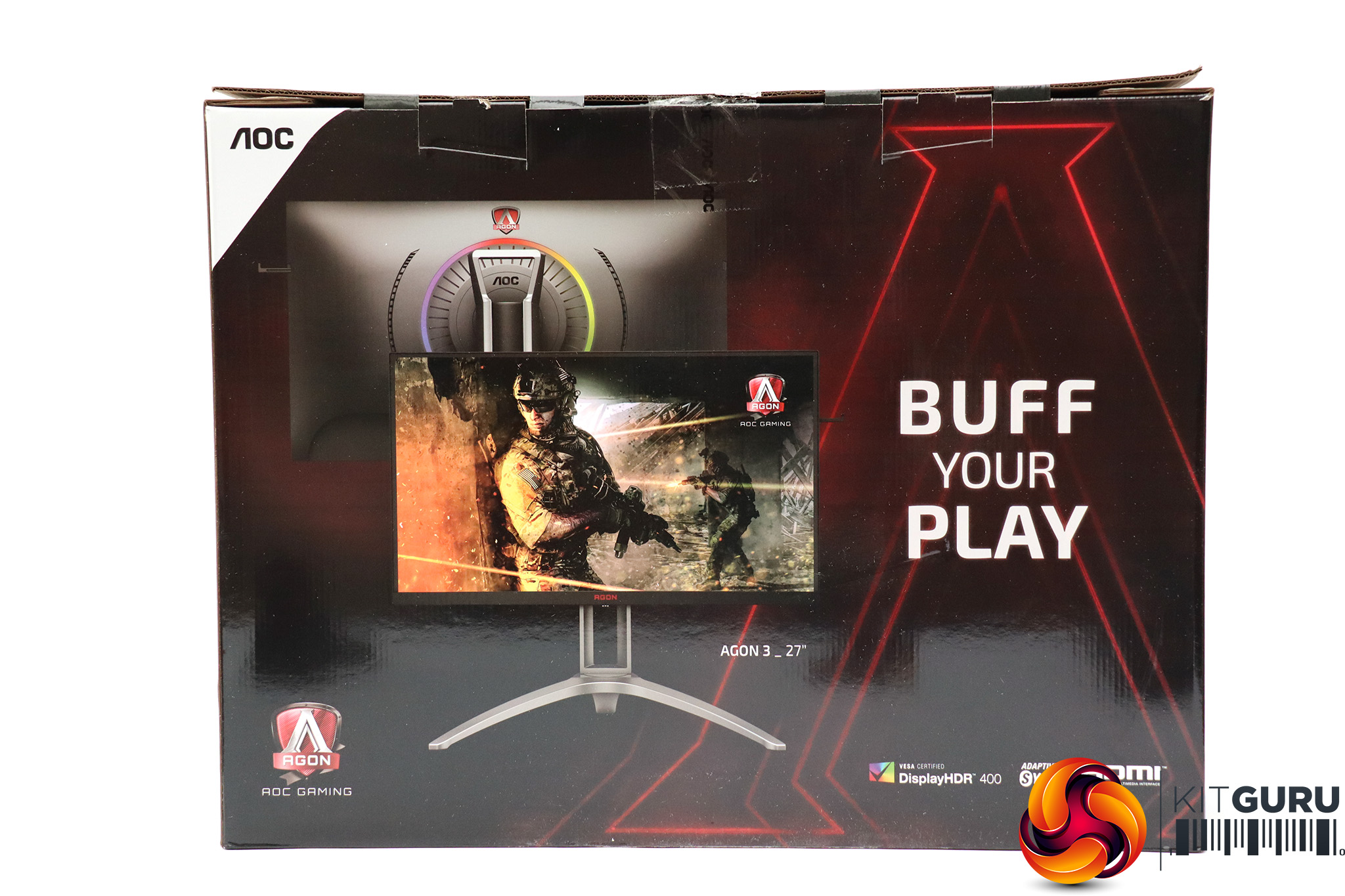 The AOC AGON AG273QX comes in a typical box for a gaming monitor, with an enticing gameplay image onscreen, although we're not sure what BUFF YOUR PLAY means. Sounds a bit like cleaning shoes.