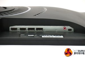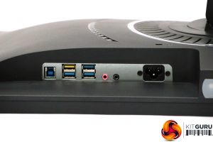 The underside of the AG273QX is veritably bristling with connectivity. On one side is the upstream and four downstream USB 3.0 ports, plus audio minijacks for a headset and microphone input. The other side houses two DisplayPort 1.2/1.4 connections and two HDMI 2.0, plus another audio minijack input and a Mini USB connection for the external OSD control puck.